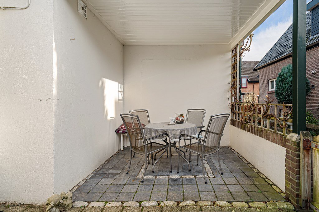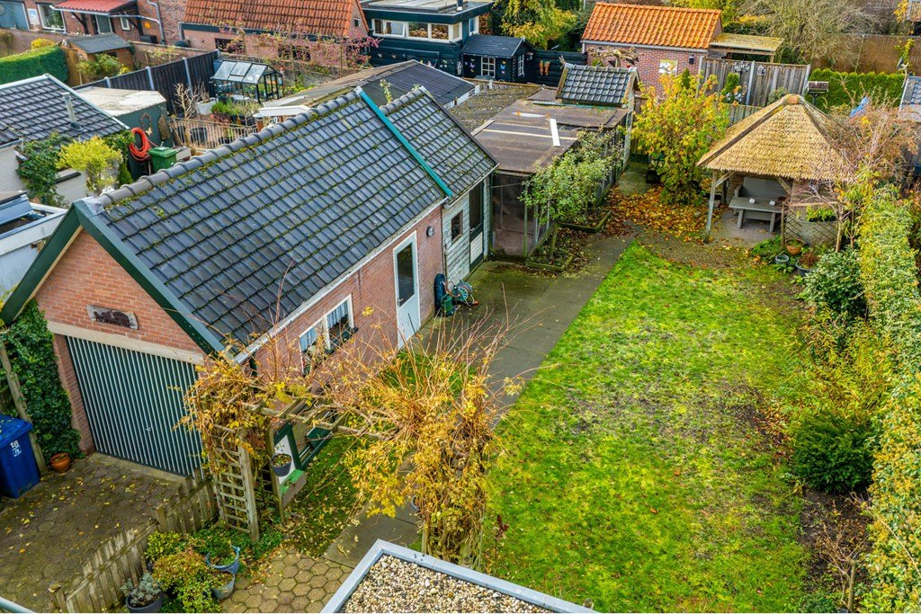 De royale achtertuin heeft, omdat er geen achtergelegen woningen zijn, volop privacy. Naast de stenen garage (met elektrische garagedeur) zijn er nog extra bergingen en een rietgedekt prieel. In de tuin zijn meerdere fruitbomen te vinden, waaronder diverse appelsoorten, peer, perzik, pruim, kers, druif en diverse bessenstruiken.