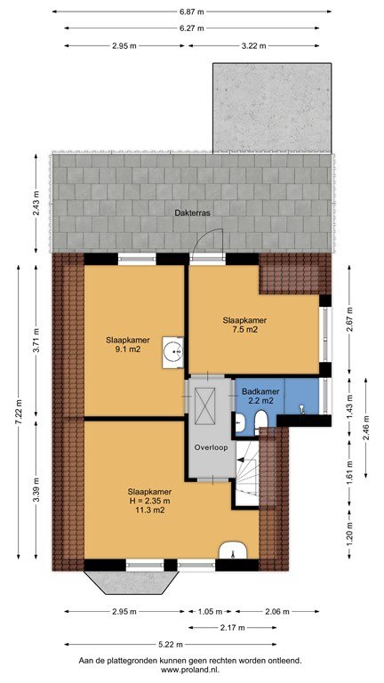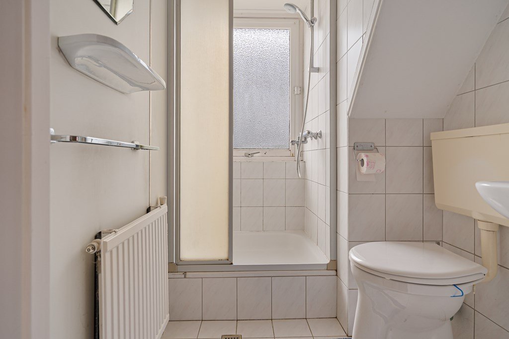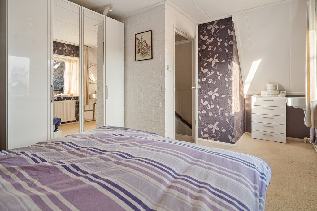 1e verdieping: overloop met toegang naar de drie slaapkamers en de tweede badkamer met tweede toilet. Aan de voorzijde ligt de ruime hoofdslaapkamer met wastafel en aan de achterzijde de twee andere slaapkamers, waarvan één met wastafel. De andere heeft een dakkapel en biedt toegang tot het plat dak.