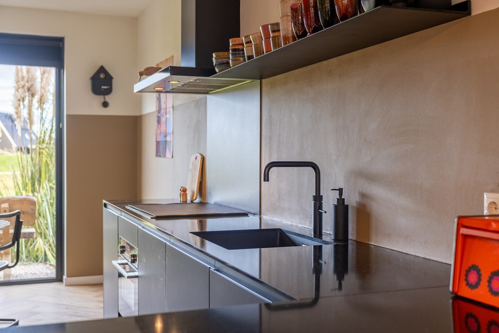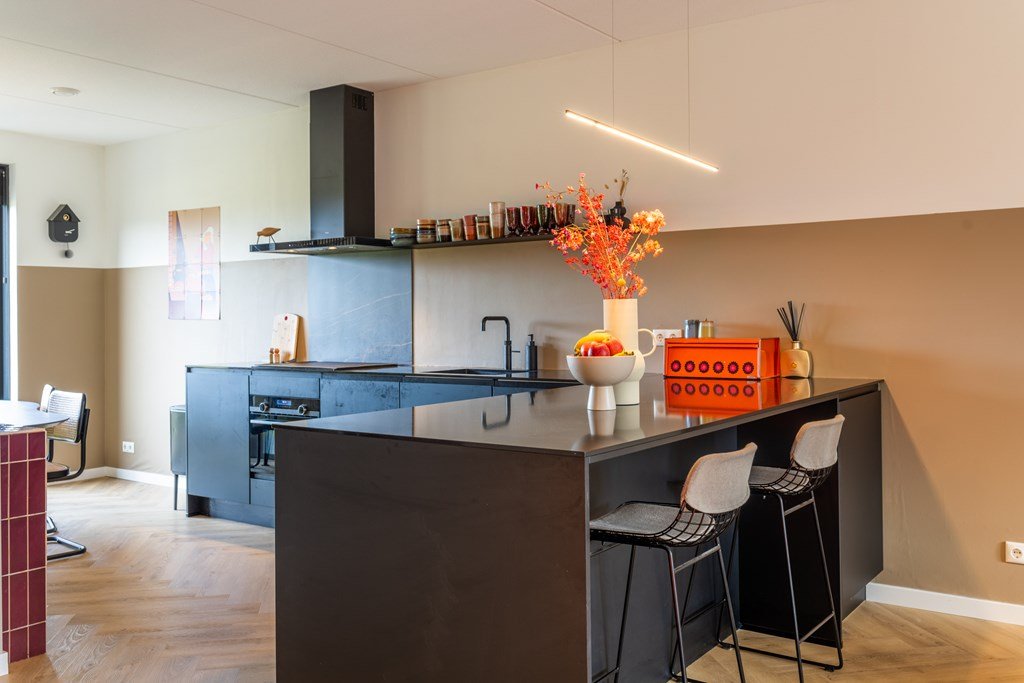 De woonkeuken is een echte eyecatcher: strak vormgegeven en voorzien van een royaal schiereiland met zitgedeelte – dé plek voor een snelle koffie of een lange borrel.
