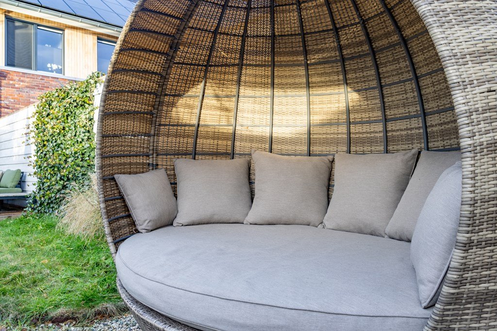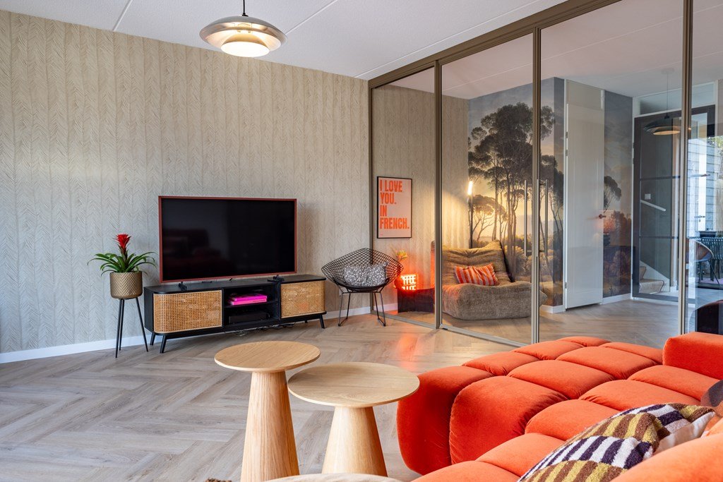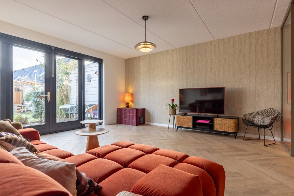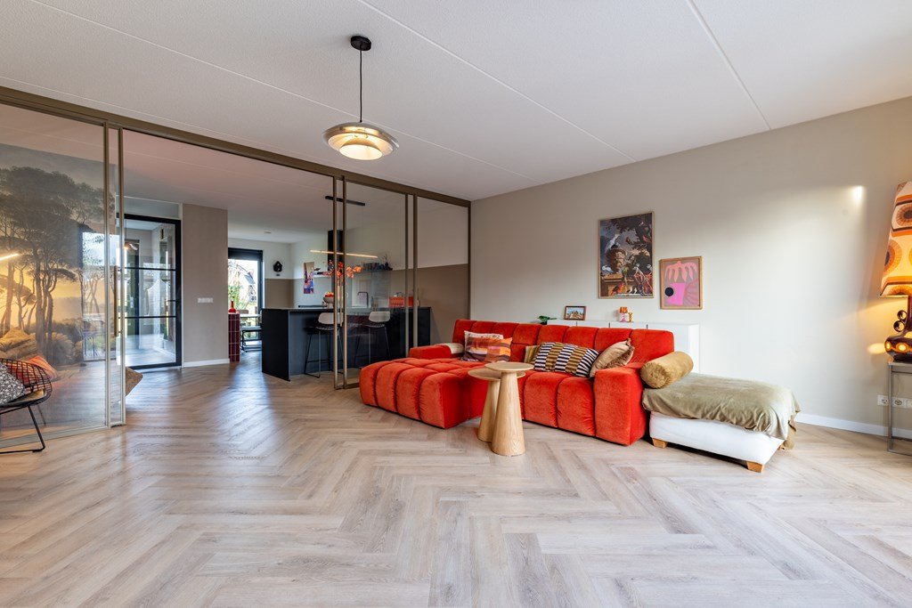 De tuingerichte woonkamer kan middels een glazen design schuifwand worden afgesloten. Zo geniet u van het beste van twee werelden: ongestoord borrelen in de woonkeuken en ontspannen in de woonkamer, zonder elkaar te storen.