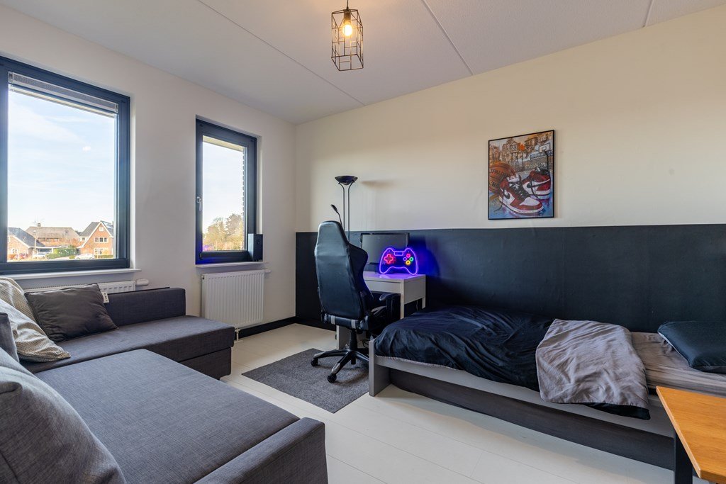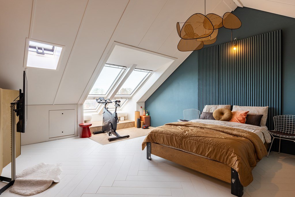 Deze ruimte is uitgerust met twee Velux Cabrio balkonvensters, die zorgen voor extra ruimte, licht en een unieke beleving. Ideaal als master bedroom, werkruimte of studio.