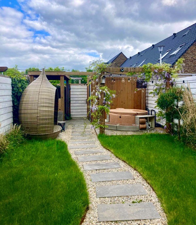 De zonnige achtertuin is gelegen op het zuidoosten en biedt volop privacy. Een heerlijke plek om te borrelen, met meerdere zitjes en een houten berging voor fietsen en tuinspullen.