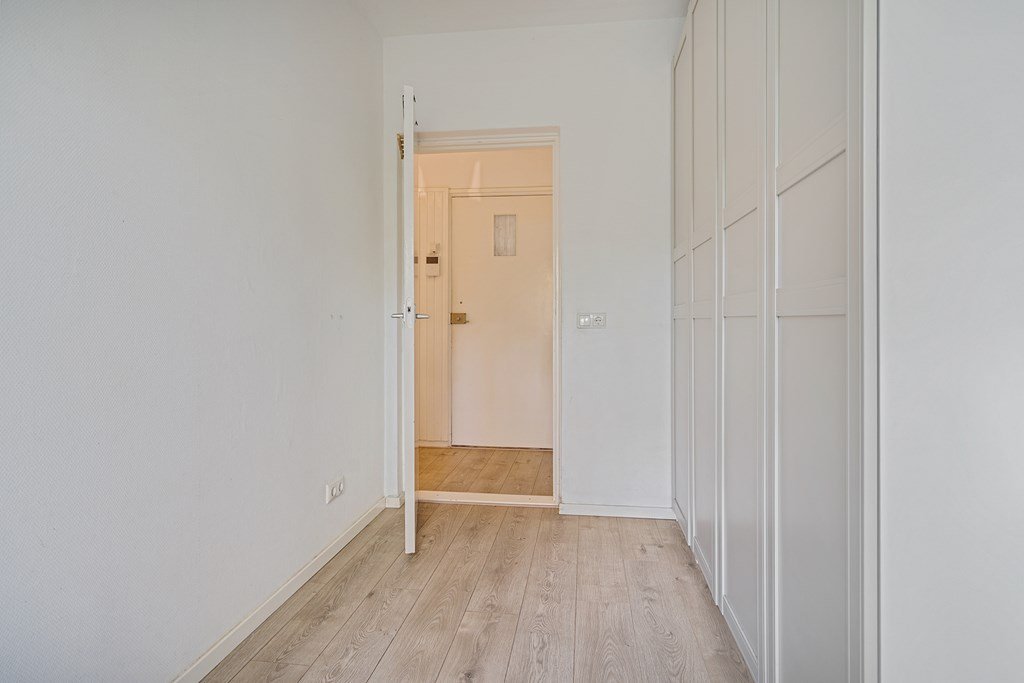De woonkamer is royaal en licht door de grote raampartijen. Ook vanuit de woonkamer is het balkon bereikbaar, wat zorgt voor een fijne verbinding tussen binnen en buiten. Vanuit de woonkamer is de grotere slaapkamer bereikbaar, gelegen aan de achterzijde van het appartement — een rustige plek, weg van de straat. Vanuit deze slaapkamer is de badkamer te bereiken, die is uitgerust met een wastafel en een inloopdouche.