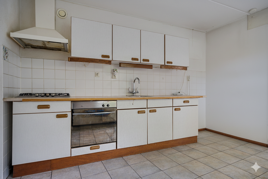 De halfopen keuken grenst aan de woonkamer en is voorzien van een inbouwoven en gaskookplaat.