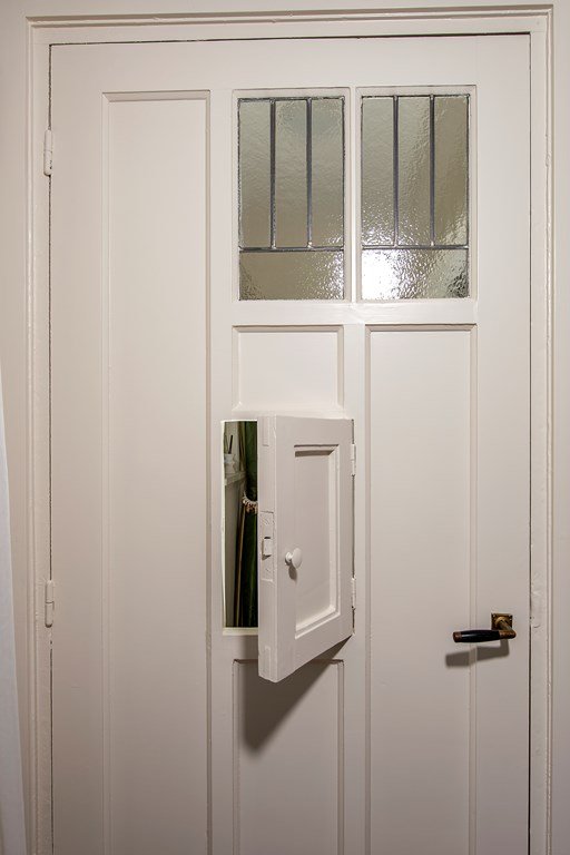 Aan de voorzijde is de hoofdingang met haar karakteristieke en met fraai raamwerk omgeven voordeur.