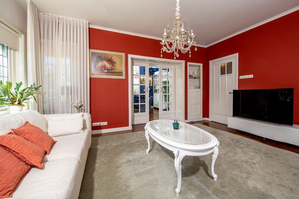 De kamer-en -suite wordt gescheiden door twee oorspronkelijke schuifdeuren met aan weerszijden, zowel in de eetkamer als in de living, de oorspronkelijke kastruimten.