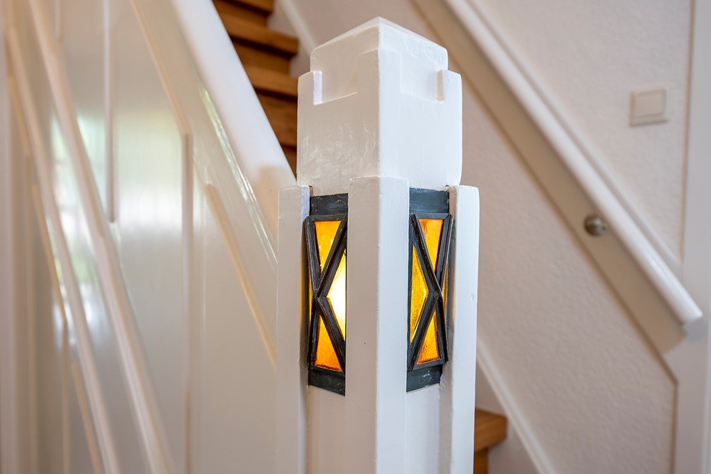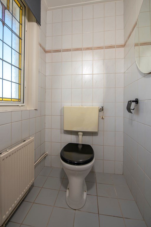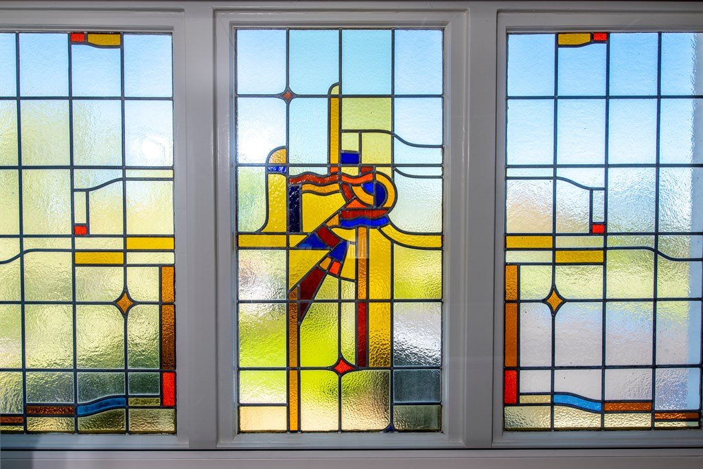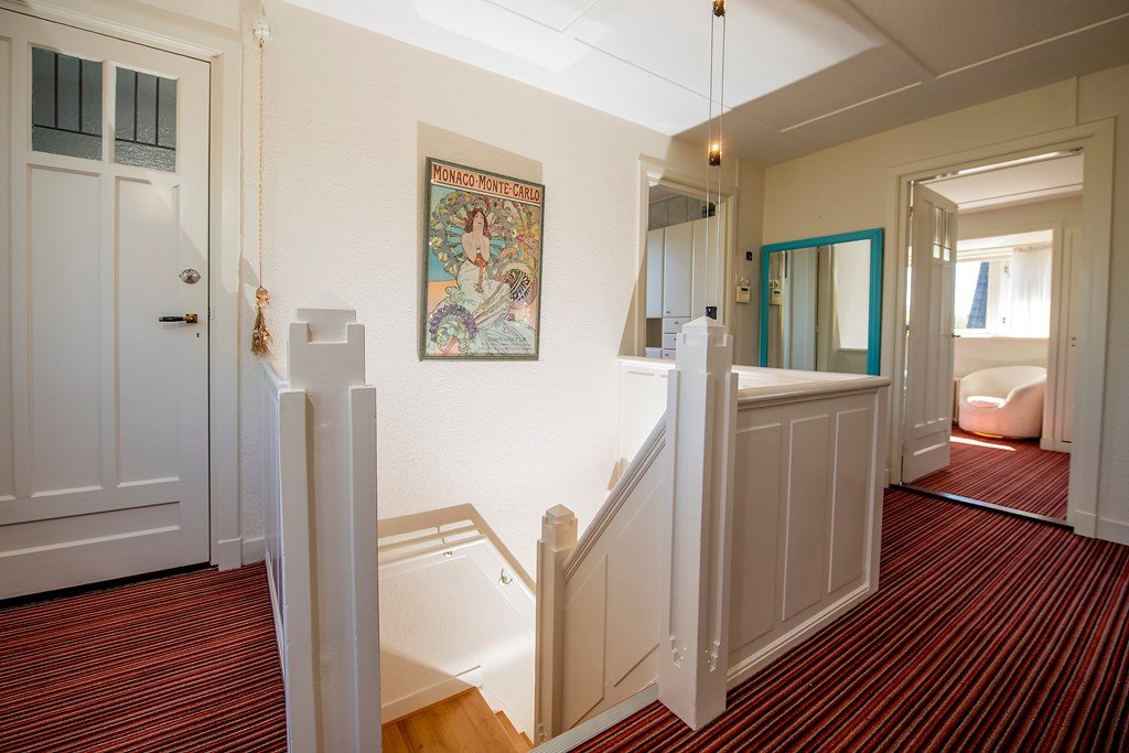 Via de trap in de hal bereikt u de 1e verdieping met een ruime overloop en alweer met prachtige glas-in-lood details. Op de verdieping bevinden zich 2 ruime slaapkamers, 1 kleinere slaapkamer, de 2e badkamer (met douche en vaste wastafel) en een separaat 2e toilet.