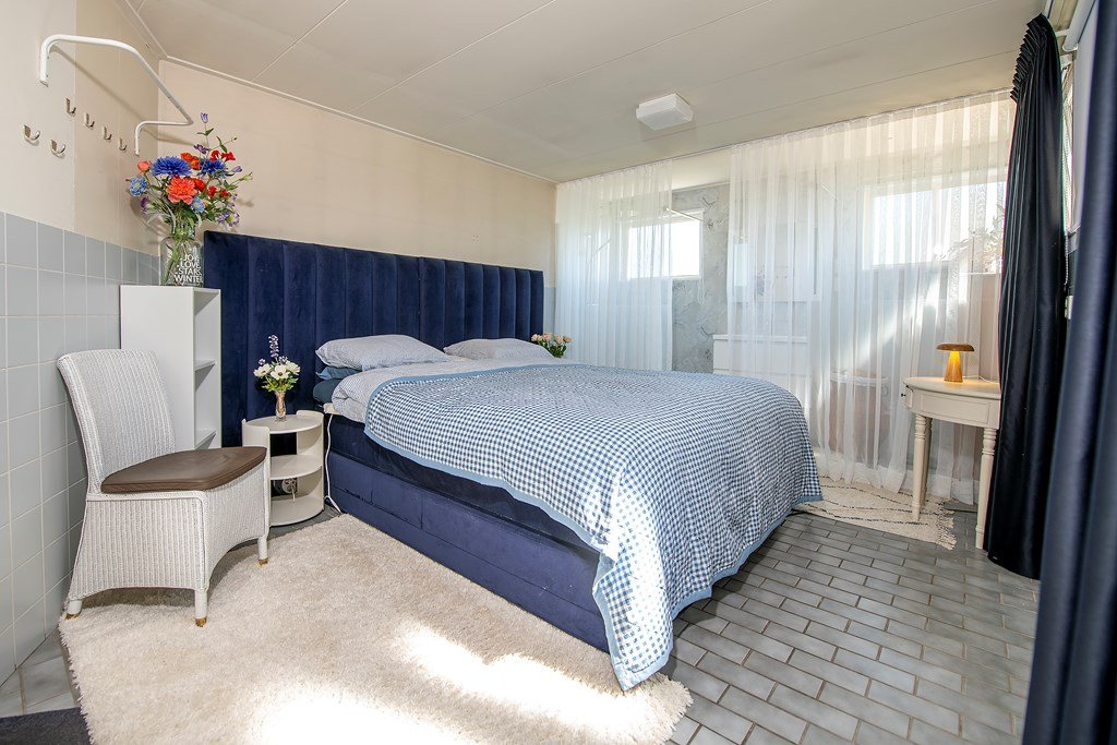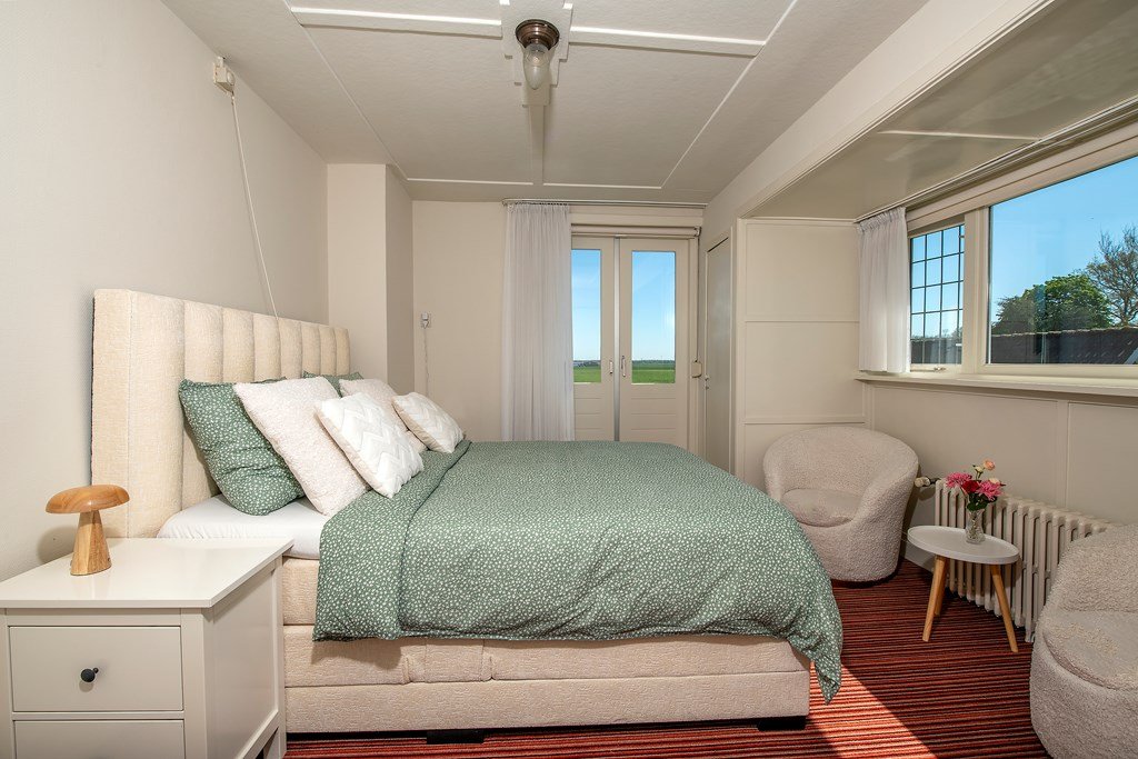 De slaapkamer aan de achterzijde en de badkamer hebben beide openslaande deuren naar het ruime balkon met prachtig uitzicht over de landerijen.