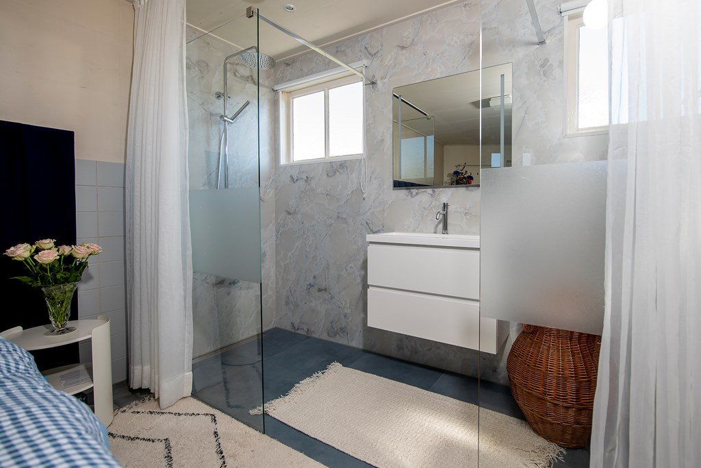 De entree naar de ruime woonkeuken bevindt zich in de grote hal, naast de living. Ook deze keuken (met o.a. inductiekookplaat, afzuigkap, koelkast, Quooker, combi magnetron en afwasmachine) heeft zijn eigen entree naar buiten én een deur naar de veranda. In de keuken is een prachtige doorgang gemaakt naar een verrassende slaapkamer mét deur naar buiten. Deze slaapkamer heeft een eigen badkamer met inloopdouche en wastafel, waardoor de woning levensloopbestendig is.