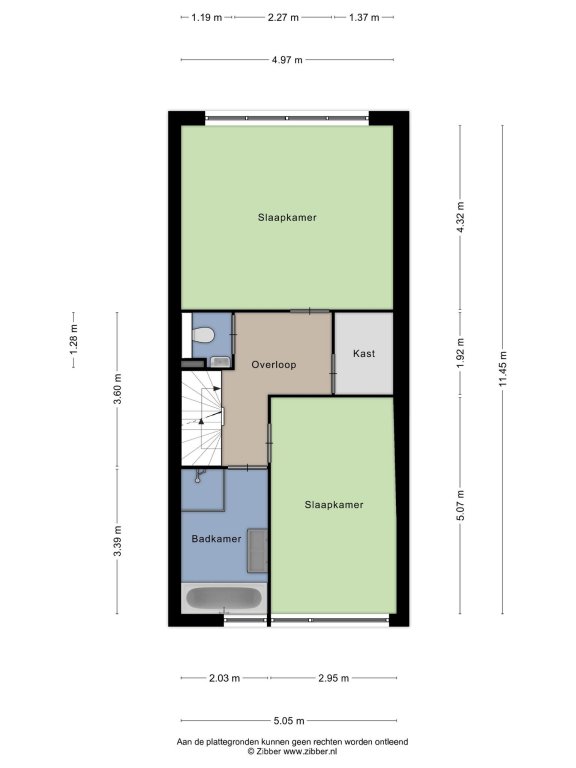 Overloop, met vaste trap naar de 2e verdieping en toegang tot alle ruimten, te weten, twee enorme slaapkamers, badkamer, aparte toiletruimte en wasruimte. De badkamer is uitgevoerd met een moderne inrichting, bestaande uit een inloopdouche met thermostaatkraan, wastafelmeubel met dubbele wastafel, ligbad met thermostaatkraan en designradiator. Aan de rustige achterzijde van de woning is de ouderslaapkamer gelegen, deze heeft maar liefst een afmeting van 4.97 x 4.32 m. De slaapkamer aan de voorzijde heeft een afmeting van 2.95 x 5.07. De wasruimte met aansluitpunten t.b.v. de was apparatuur. Toiletruimte beschikt over een closet en een fonteintje.