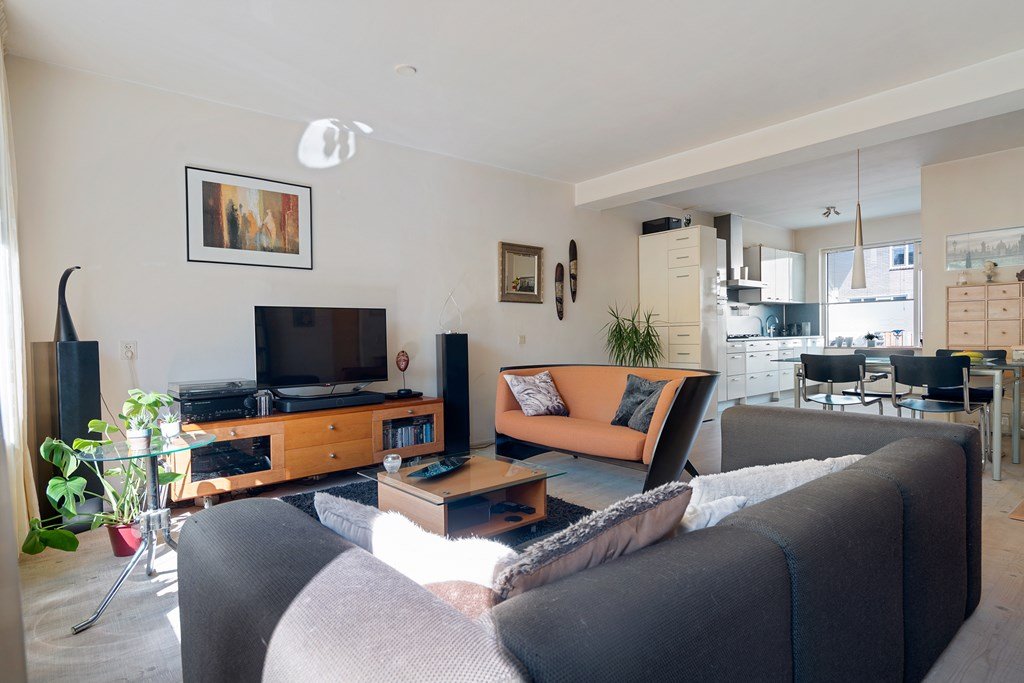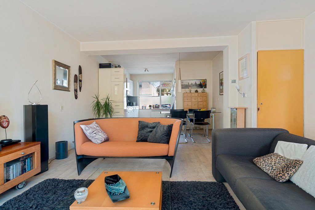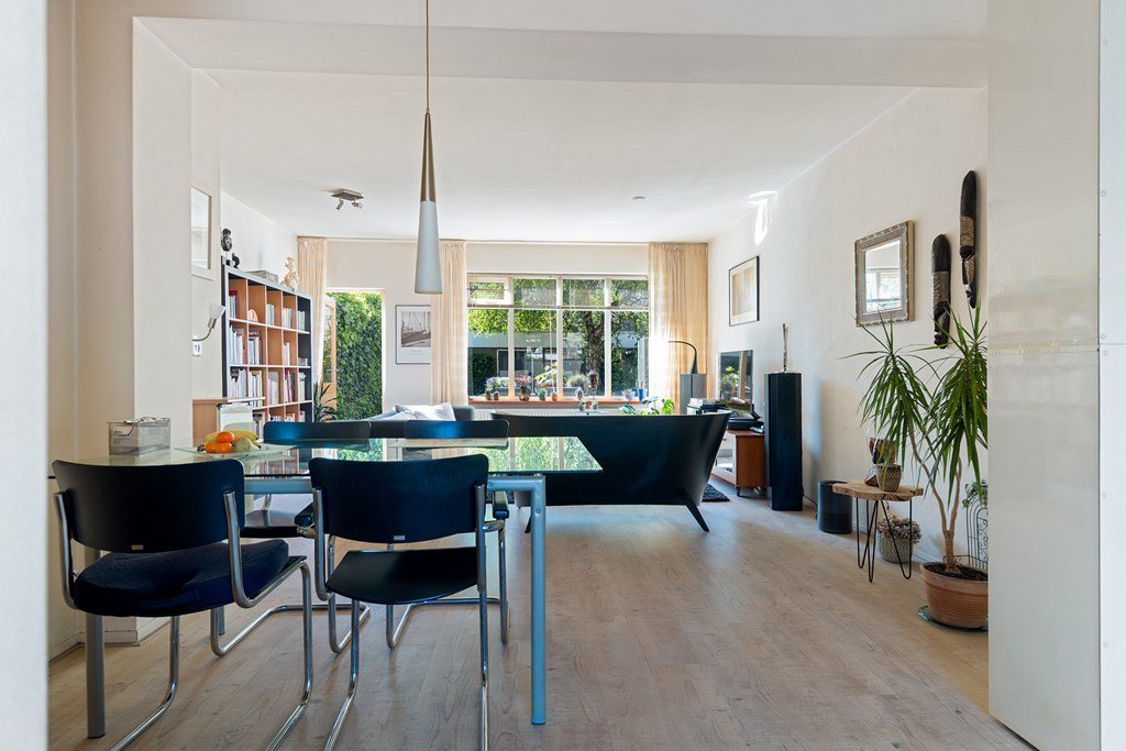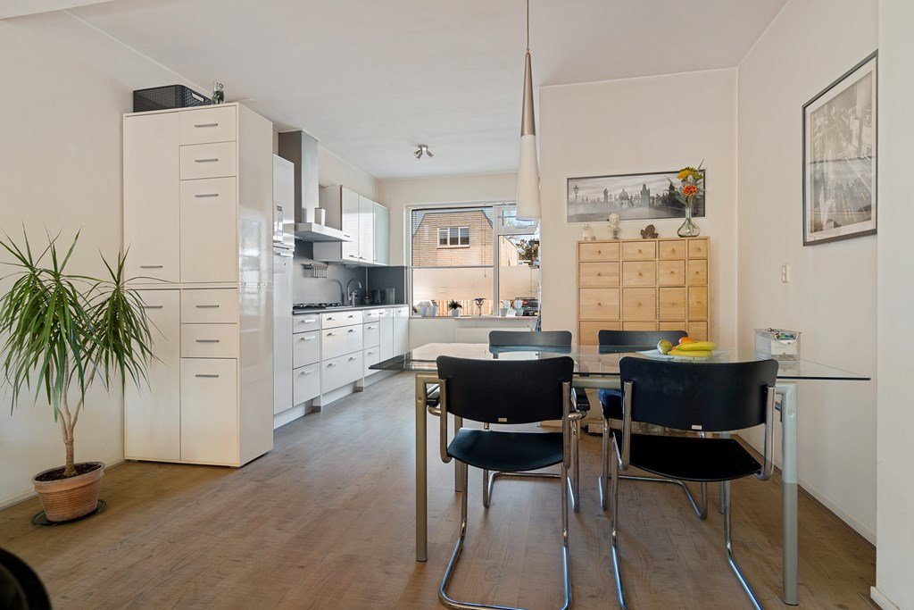 woonkamer met open keuken en deur naar de tuin. De open keuken (2006) is voorzien