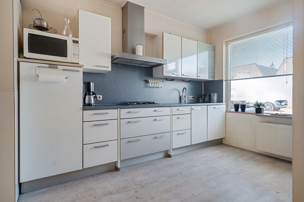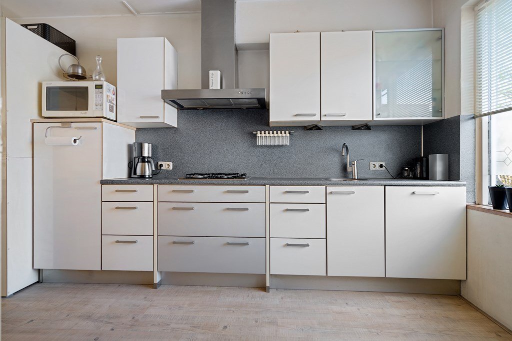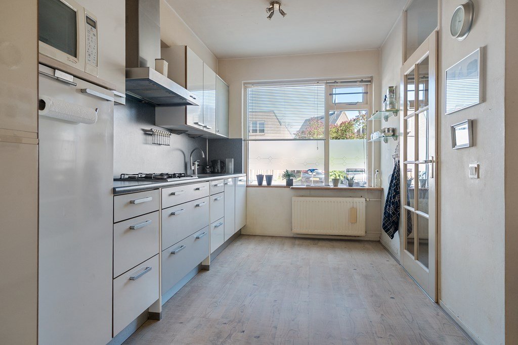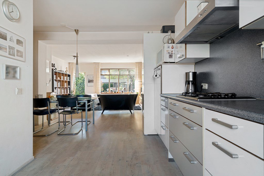 van koelkast, vaatwasser (2024) en gasfornuis met afzuigkap. De lichte woonkamer is