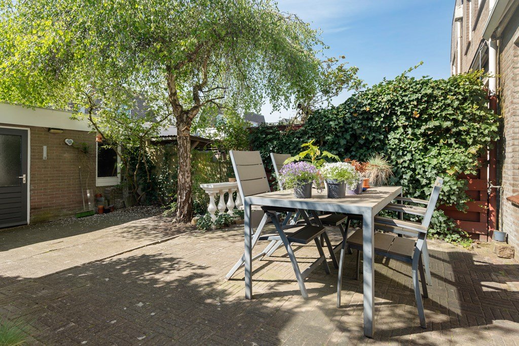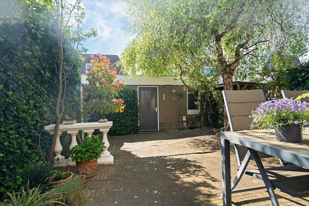 De tuin ligt gunstig op het zuiden en biedt volop zon. Achter de tuin staat een
