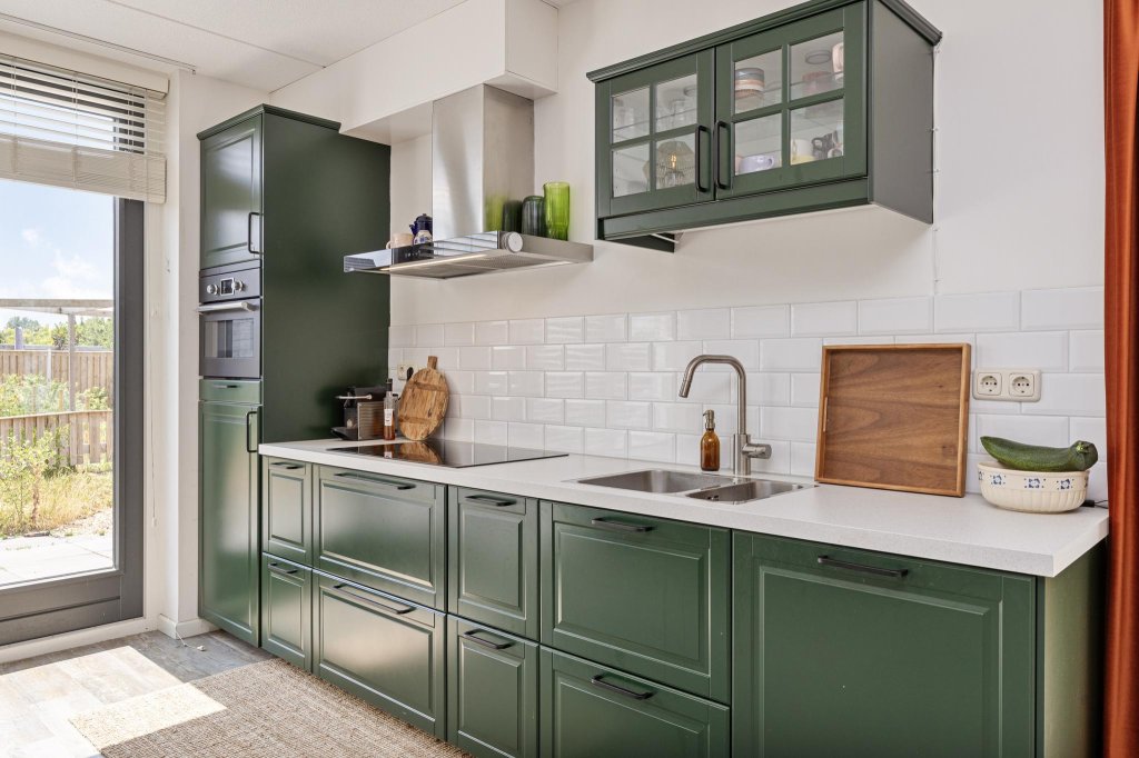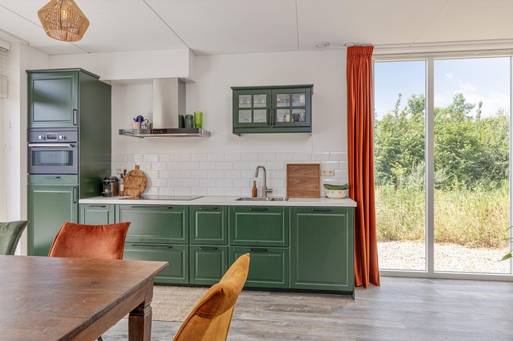 De gezellige groene keuken is voorzien van alle gemakken, zoals vaatwasser, koelkast, inductieplaat, oven en afzuigkap.
