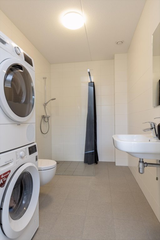 De badkamer heeft een heerlijke grote inloopdouche, wastafel, toilet en wasmachine aansluiting.