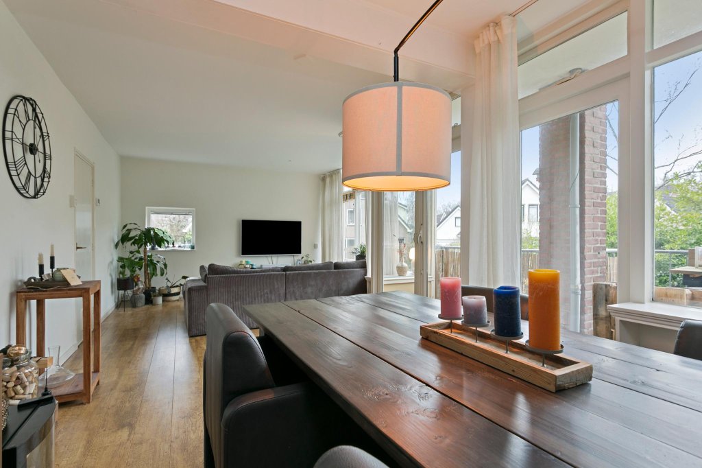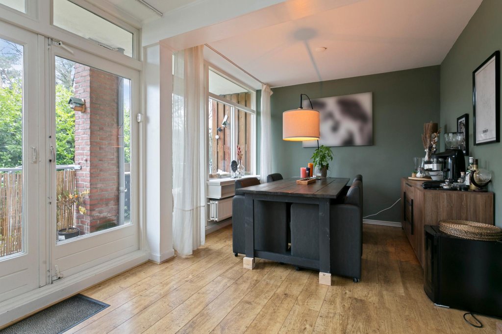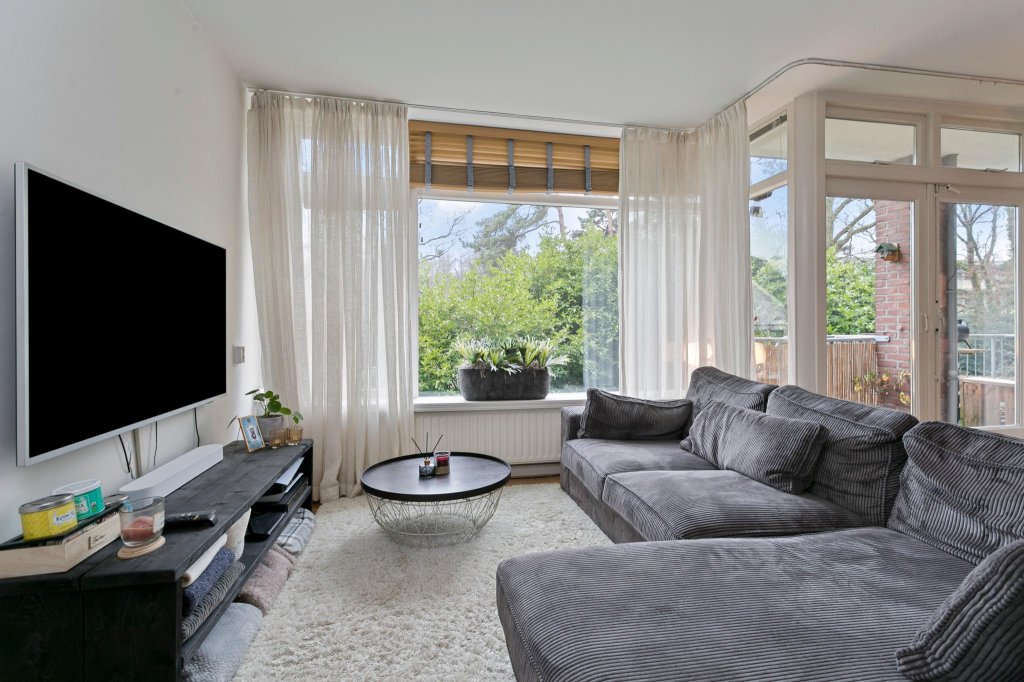 De woonkamer is zeer ruim (± 30m2). De grote raampartijen geven veel lichtinval en uitzicht op groen. Het in de huidige situatie als eetkamer ingerichte gedeelte van de woonkamer heeft voldoende ruimte voor een flinke eettafel. Het op het zuiden gelegen balkon is via openslaande deuren te bereiken. Extra bij dit appartement is een trap vanaf het balkon welke leidt naar de groene, gezamenlijke tuin.