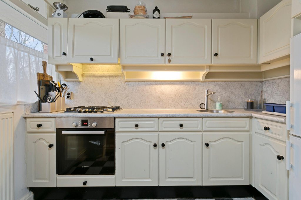 De praktische keuken, met voldoende opbergruimte, is voorzien van een combi-oven/magnetron, een afzuigkap en een koel/vries combinatie. Gekookt wordt er op gas.