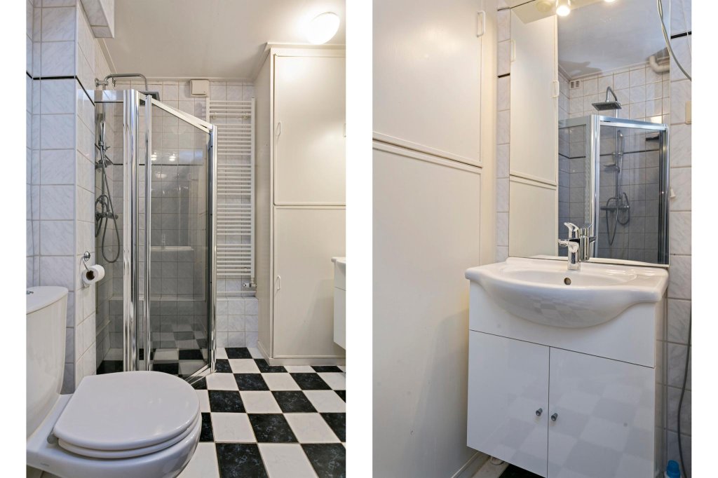 De moderne, geheel betegelde badkamer is voorzien van een douchecabine, wastafel met meubel, het toilet en een designradiator. De aansluitingen voor de wasmachine en de droger bevinden zich eveneens in de badkamer.