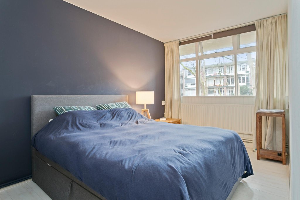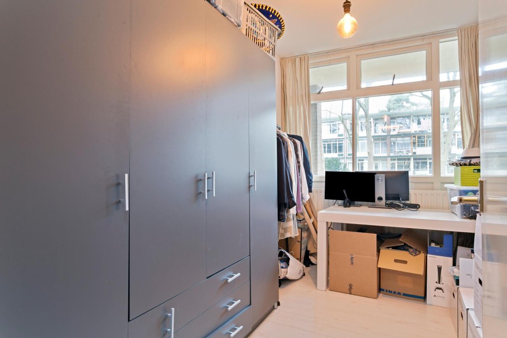 De grootste slaapkamer biedt voldoende ruimte voor een tweepersoonsbed en wat kastruimte. De iets kleinere tweede slaapkamer kan als thuiswerkplek worden ingericht of (zoals nu) als ruimte voor grote kledingkasten. Een combinatie daarvan kan natuurlijk ook.