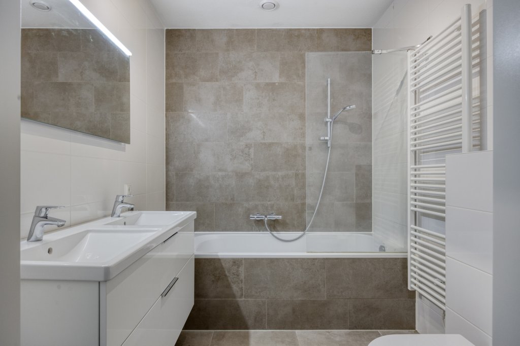 vloerverwarming die apart regelbaar is. De moderne badkamer beschikt over een ligbad-