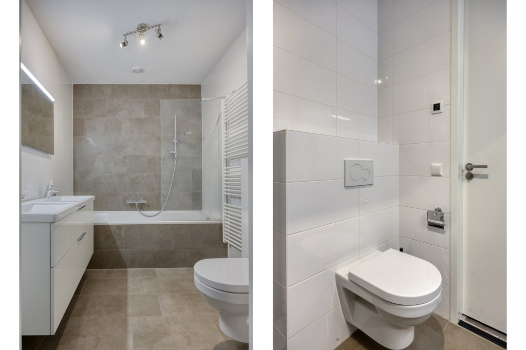 douchecombinatie, dubbele wastafel en toilet. Tegenover de badkamer ligt een ruime