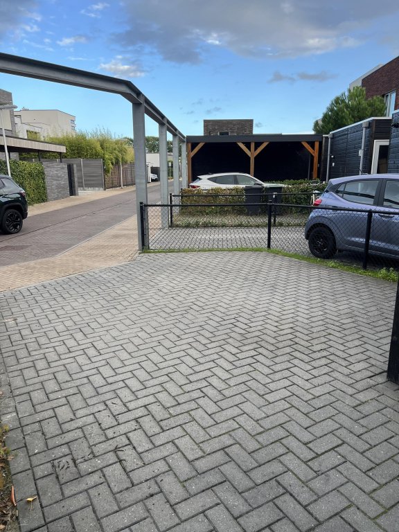 de tuin(ca. 28m2) met berging en twee eigen parkeerplaatsen. Deze is al voorbereid voor