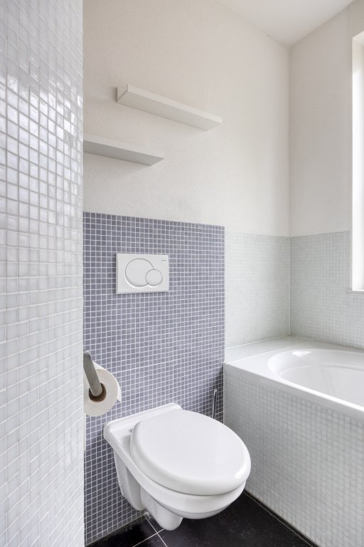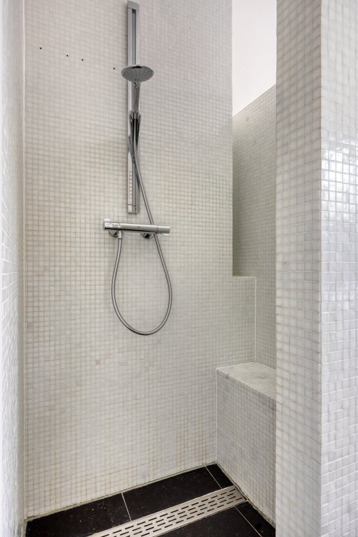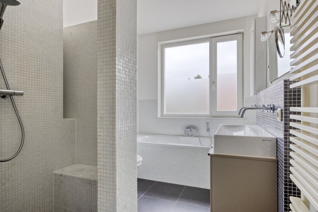 Op deze verdieping bevinden zich drie ruime slaapkamers, allemaal voorzien van volledig elektrische rolluiken voor optimale verduistering en comfort. De luxe badkamer is volledig betegeld en heeft vloerverwarming, een ruime handdoekradiator, een inloopdouche met mozaïek bankje, een zwevend toilet en een groot ligbad met handdouche. De dubbele wastafel biedt veel opbergruimte. De hal is voorzien van een stoffen vloer en de slaapkamers zijn afgewerkt met parketvloeren, wat zorgt voor een warme, stijlvolle uitstraling.