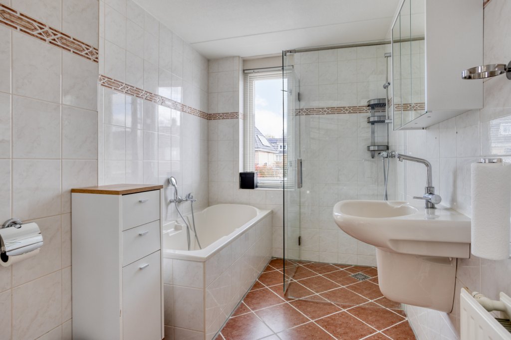 Hier bevinden zich drie slaapkamers en een complete badkamer, uitgerust met een ligbad, douche, toilet en wastafel.