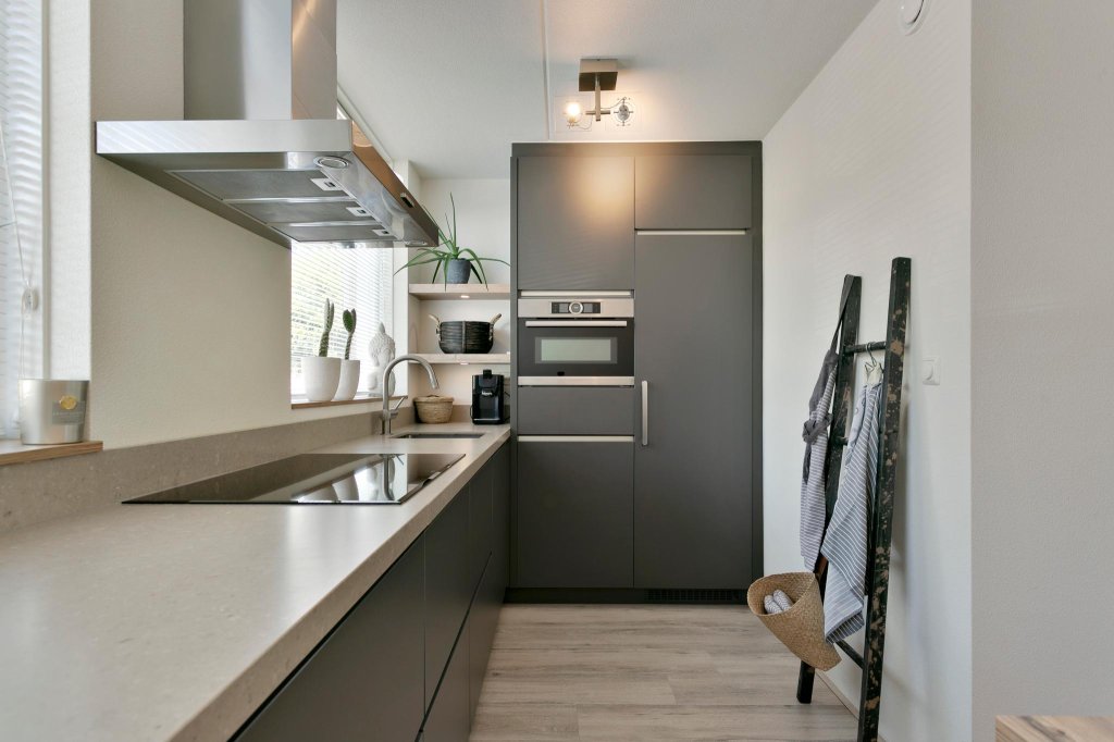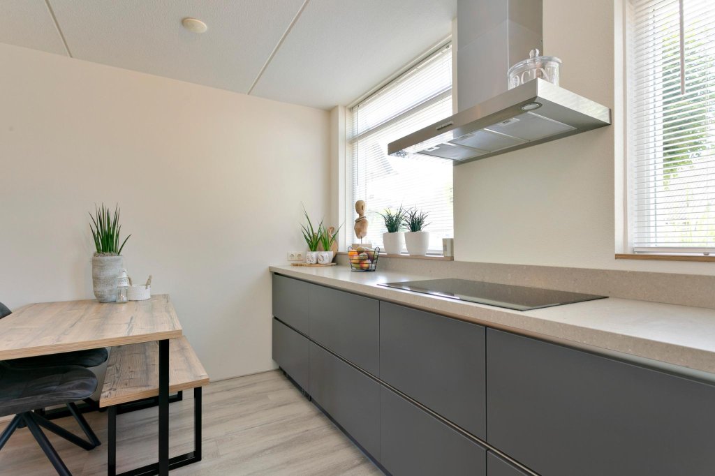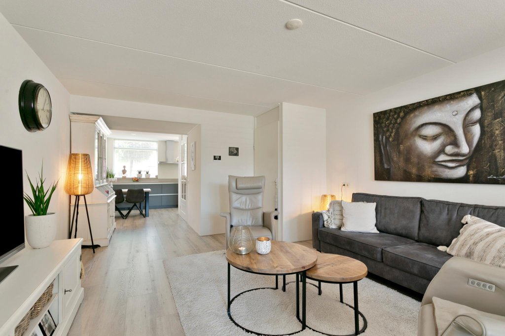 Begane grond: entree, hal, vrij hangend toilet met fontein, tuingerichte woonkamer met tuindeur naar de tuin met prachtige overkapping en voorzien van bijzonder fraaie open keuken (2018) voorzien van inductie kookplaat met RVS afzuigkap, koel-vries combinatie, vaatwasser en combimagnetron.