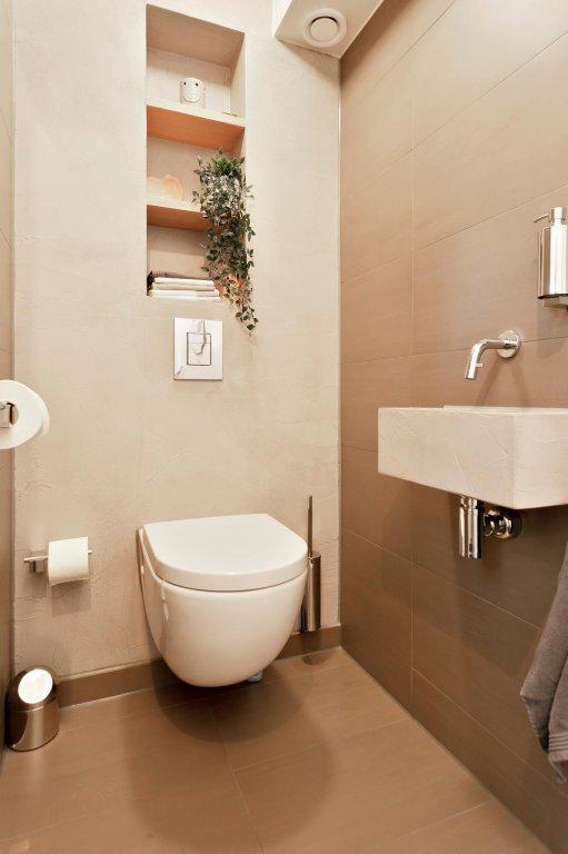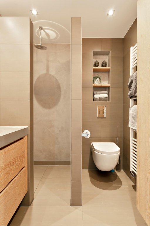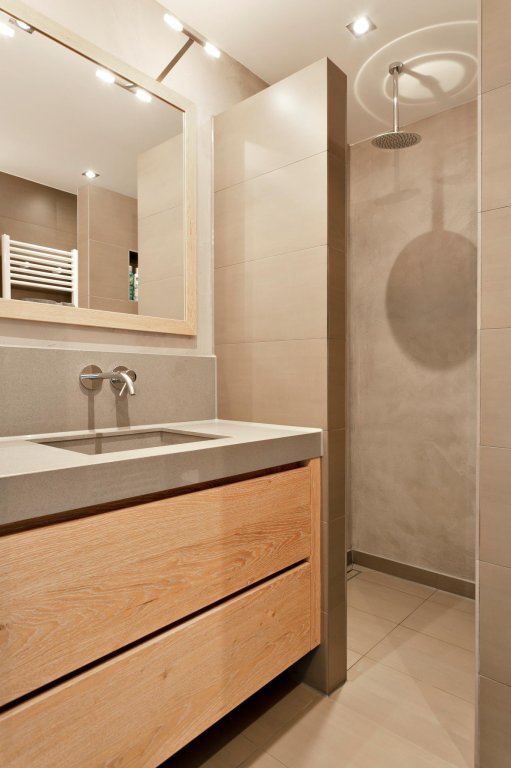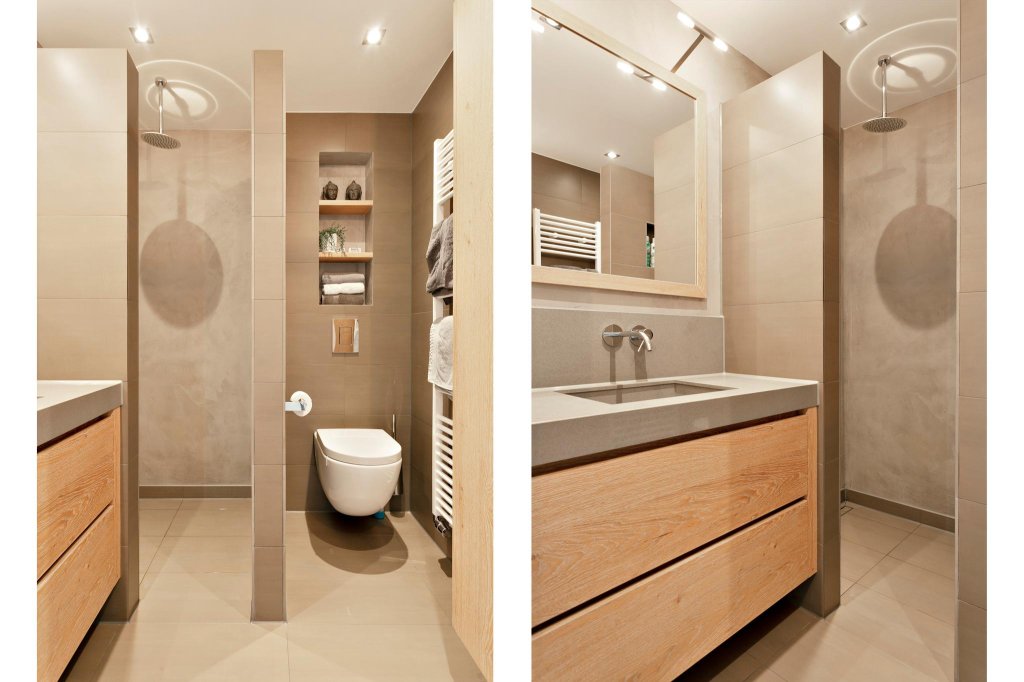 1e verdieping: 2 ruime slaapkamers, moderne badkamer met vrij hangend wandcloset, ruime inloopdouche en prachtig wastafelmeubel, vaste trap naar...