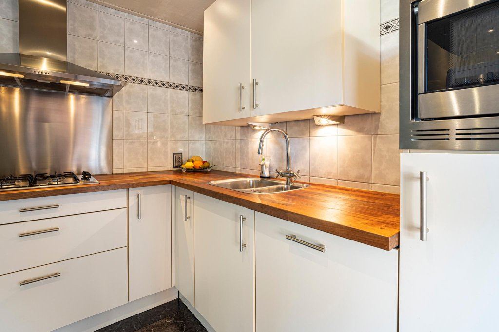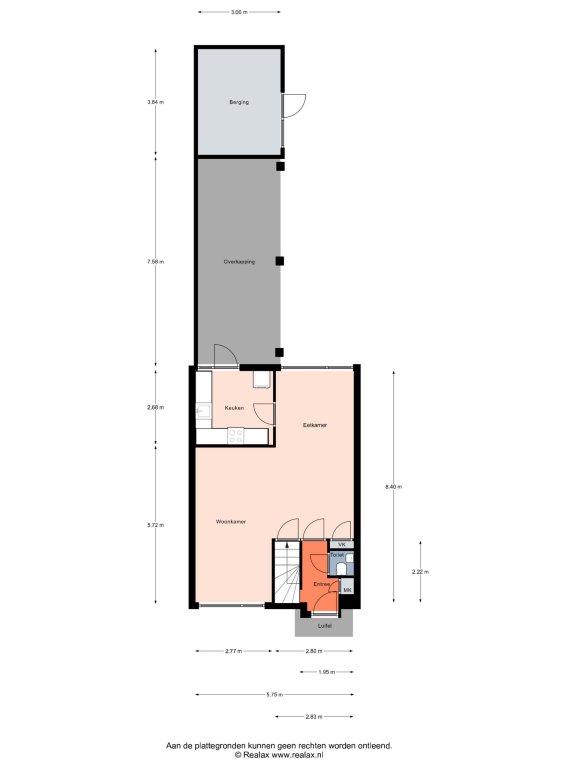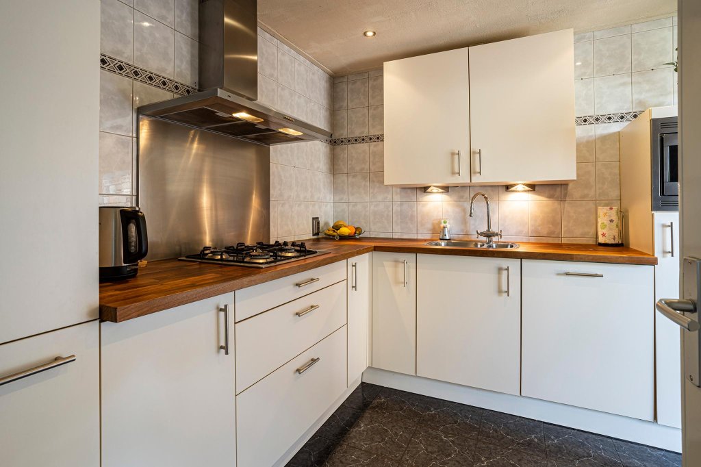 Entree/hal met toilet, meterkast en trapopgang. Woonkamer met een vaste kast onder de trap. Dichte keuken met diverse apparatuur als een vaatwasser combi magnetron, koelkast en gaskookplaat en de deur naar de tuin, die beschikt over een prachtige ruime overkapping.