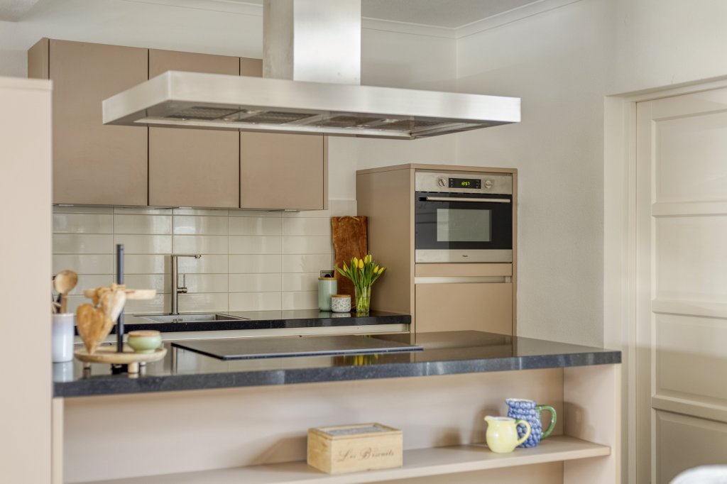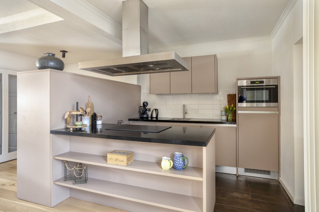 - Mooie, moderne en lichte keuken met apparatuur, een groot werkblad en een kookeiland.
