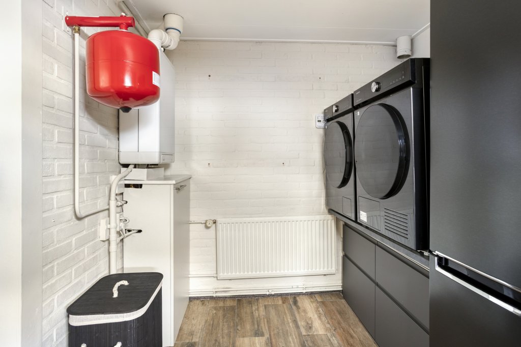 Begane grond: Laten we via de voordeur naar binnen gaan. We komen dan in een gang met de trapopgang, het toilet, de meterkast, de trapkast en de doorgang naar de woonkamer. Deze leefkamer heeft een grote uitbouw en een open keuken. De gekozen oplossing is meer dan mooi en zorgt er voor dat niet alleen de zitkamer, maar ook de grote eettafel voldoende ruimte hebben. De oorspronkelijk vrijstaande schuur is door de uitbouw gekoppeld aan de woning. Zo kon er naast een berging ook een mooie bijkeuken aan de keuken worden toegevoegd. Een bijkeuken met de aansluitingen voor de wasmachine, de droger en de Cv-ketel, maar ook bergruimte. Vanuit de bijkeuken bereiken we de achtertuin, onder de overkapping en dus droog. Deze overkapping, maar ook de gehele tuin ademt dezelfde mooie kwaliteit als de woning.