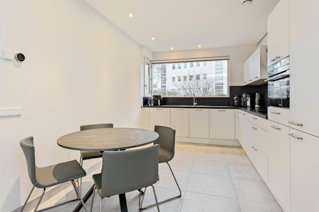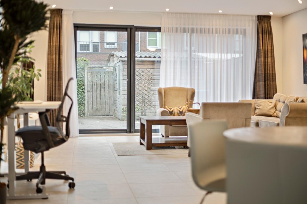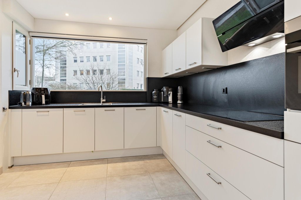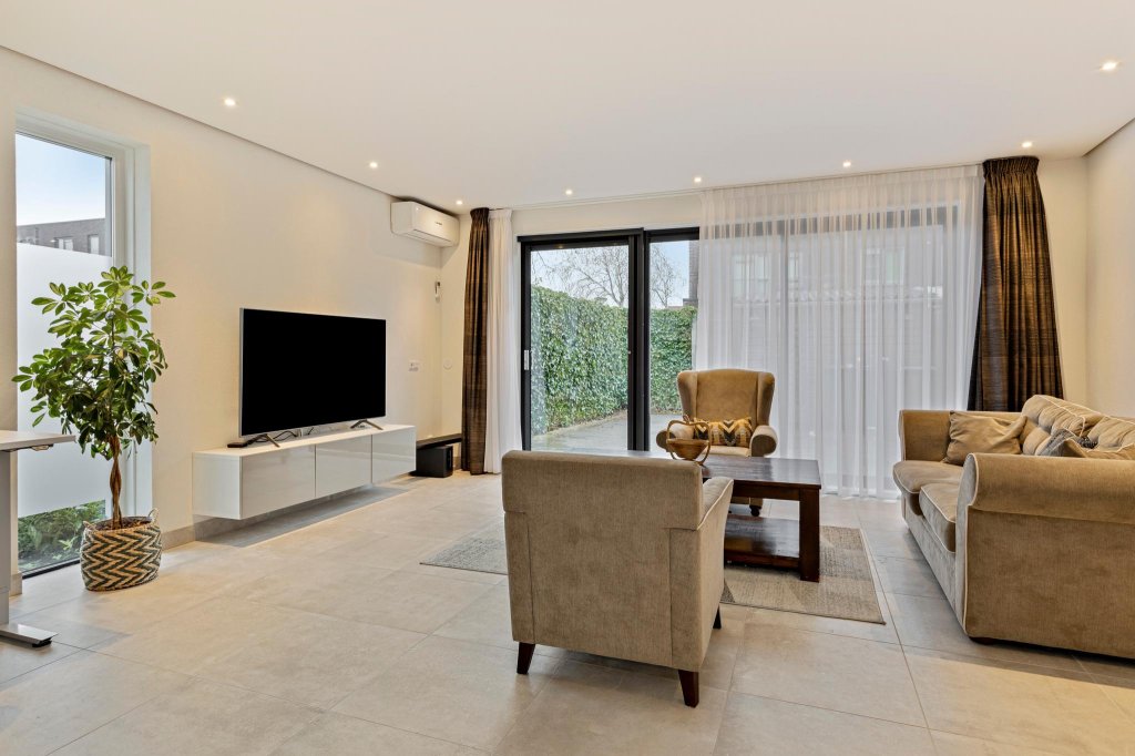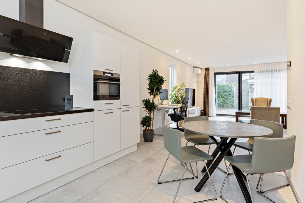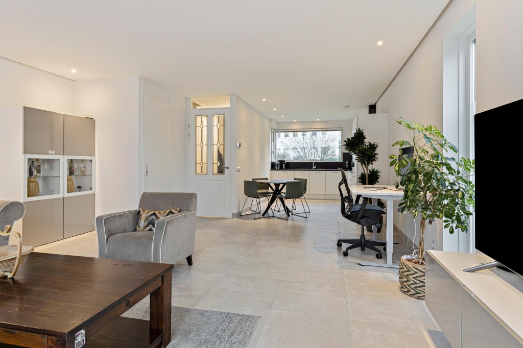Begane grond: hal, toilet, zeer royale en uitgebouwde living (36 m²) met schuifpui naar zonnig terras, strak nieuw spandoek plafond met smart Philips Hue verlichting, fraaie nieuwe tegelvloer voorzien van een comfortabele vloerverwarming en airco. De open keuken is voorzien van een fraaie hoekkeuken (2020) met inbouwapparatuur waaronder een 5-pits kookplaat met afzuigkap, combimagnetron, vaatwasser en een koel-vries combinatie.