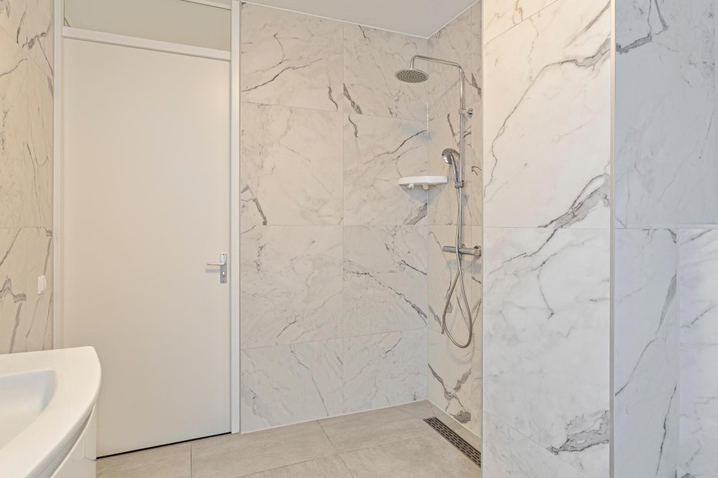 1e verdieping: overloop, 3 slaapkamers, luxe badkamer (2020) met inloopdouche, fraai wastafelmeubel en 2e toilet. Vaste trap naar: