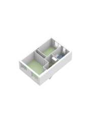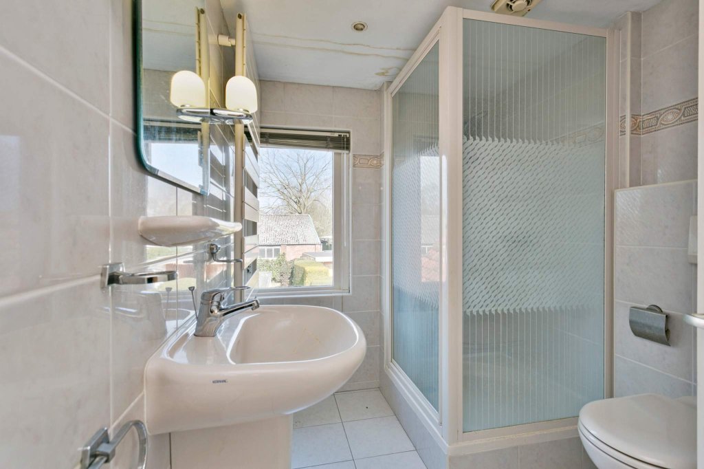Eerste verdieping: overloop, twee slaapkamers en badkamer met wastafel, douche en toilet.