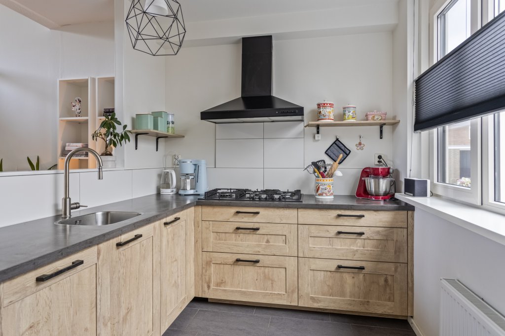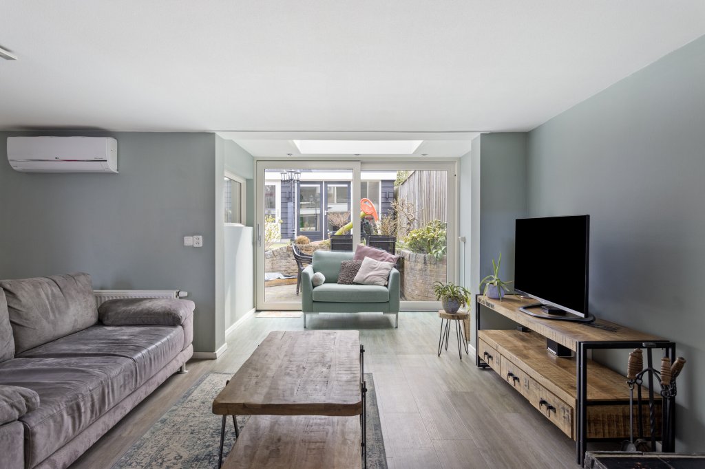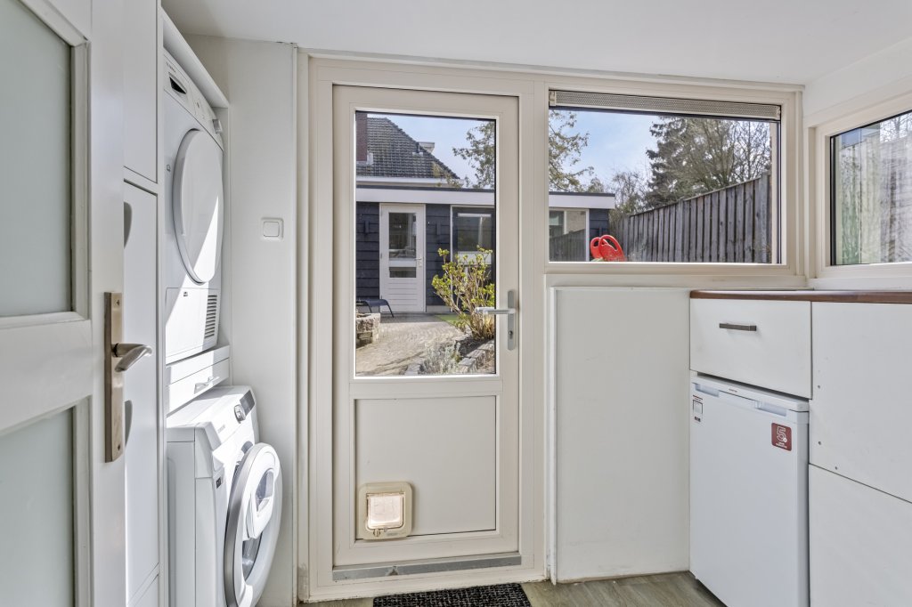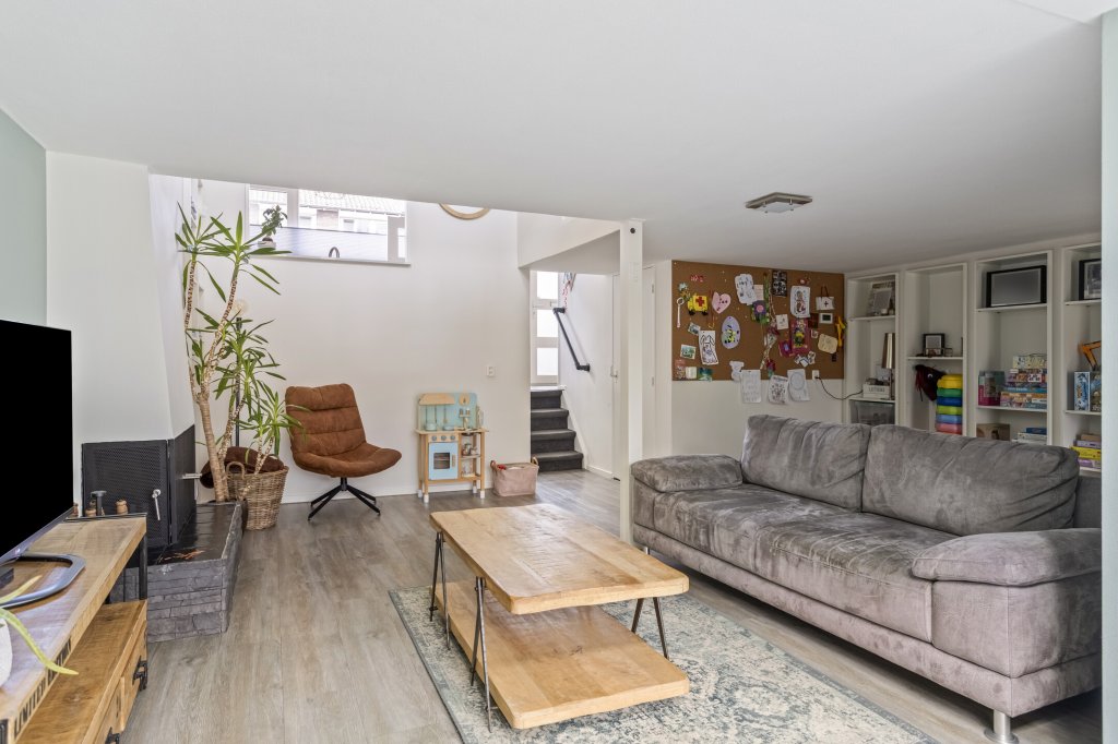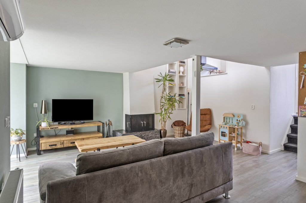 Hal/entree met aan de linkerzijde toiletruimte en aan de rechterzijde de keuken, deze is voorzien van diverse inbouwapparatuur en doorkijk naar de woonkamer. Via een trapje naar beneden (souterrain) bereikt u de sfeervolle ruime woonkamer met openhaard In de bijkeuken bevinden zich aansluitingen voor wasmachine/droger, extra kraan en een net werkblad + extra opbergruimte. Vanuit de woonkamer komt u in de mooi aangelegde achtertuin met een ruime tuinkamer en terras onder het balkon.