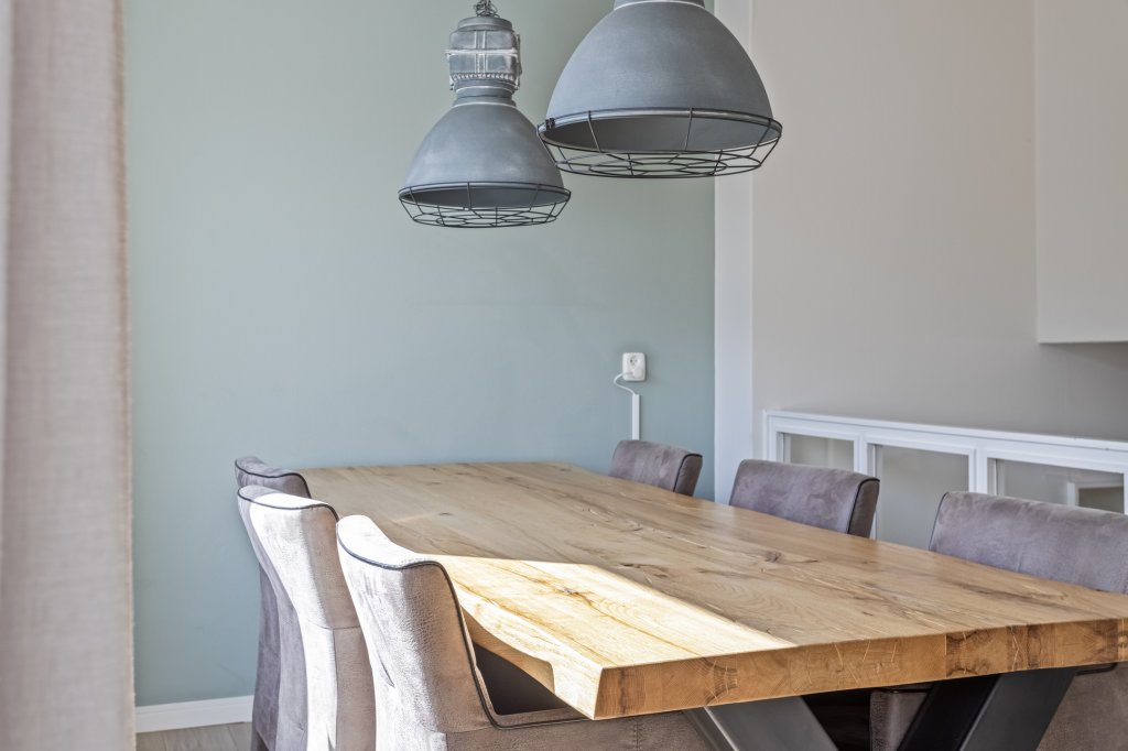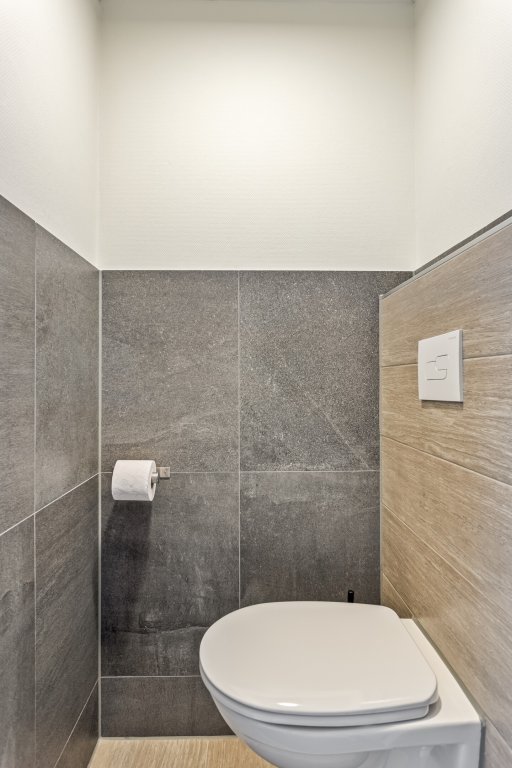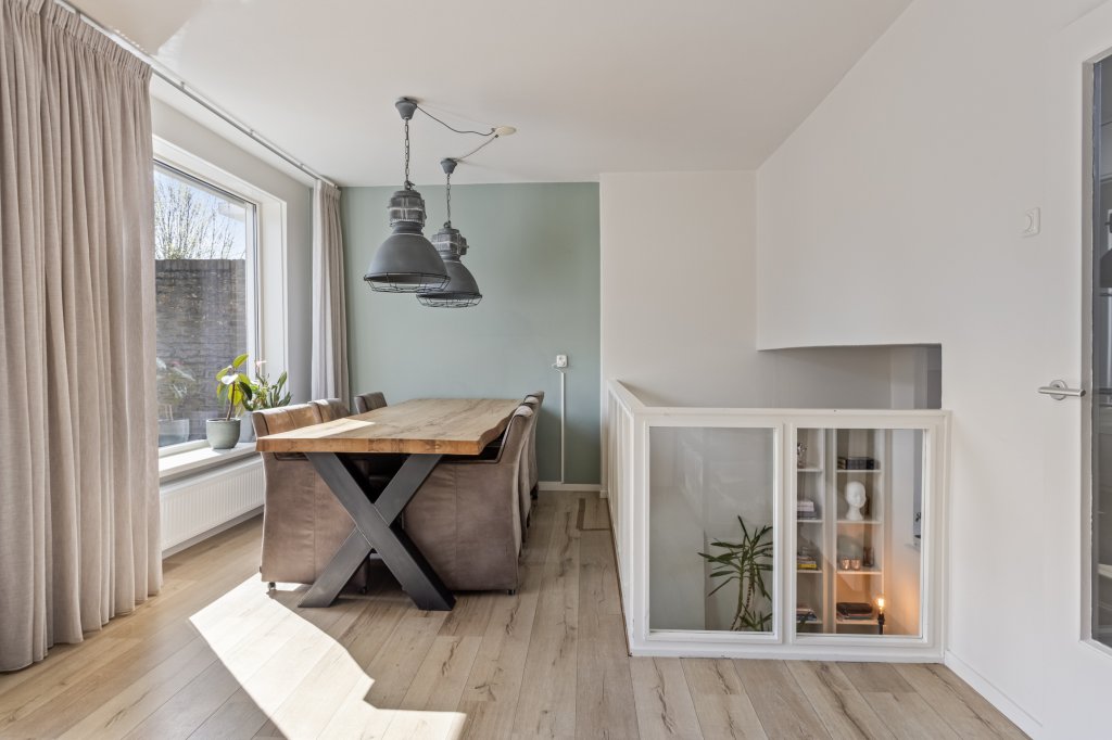 Via de hal op de begane grond gaat u een verdieping omhoog alwaar u de eetkamer bereikt welke in directe verbinding staat met de keuken en woonkamer d.m.v. een vide. De eetkamer geeft tevens toegang tot het dakterras.