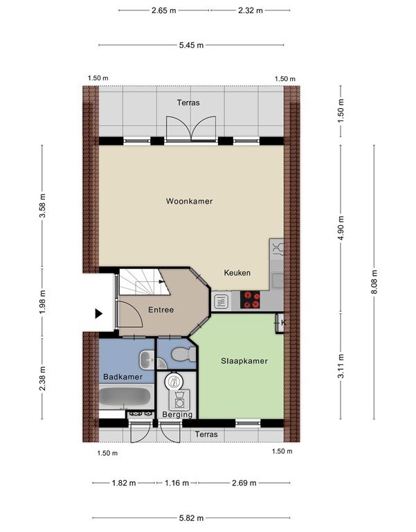 Aan de linkerzijde treedt u de sfeervolle, lichte woonkamer binnen. Het interieur is fris en modern, en de openslaande terrasdeuren verbinden binnen naadloos met de diepe tuin. De open keuken is van alle gemakken voorzien, waaronder een vaatwasser, koelkast met vriesvak, kookplaat en een ingebouwde combi-oven/magnetron.