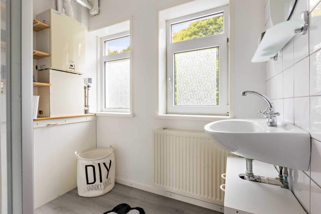 Tweede verdieping: overloop, drie ruime slaapkamers, waarvan twee met toegang tot het fijne dakterras. Badkamer met douche, wastafel, wasmachineaansluiting en opstelling van de cv-ketel.