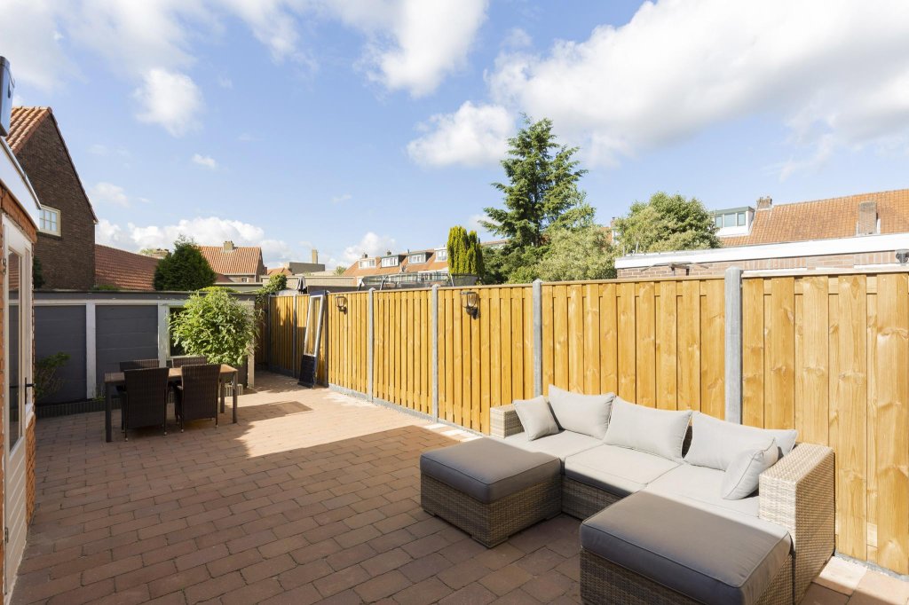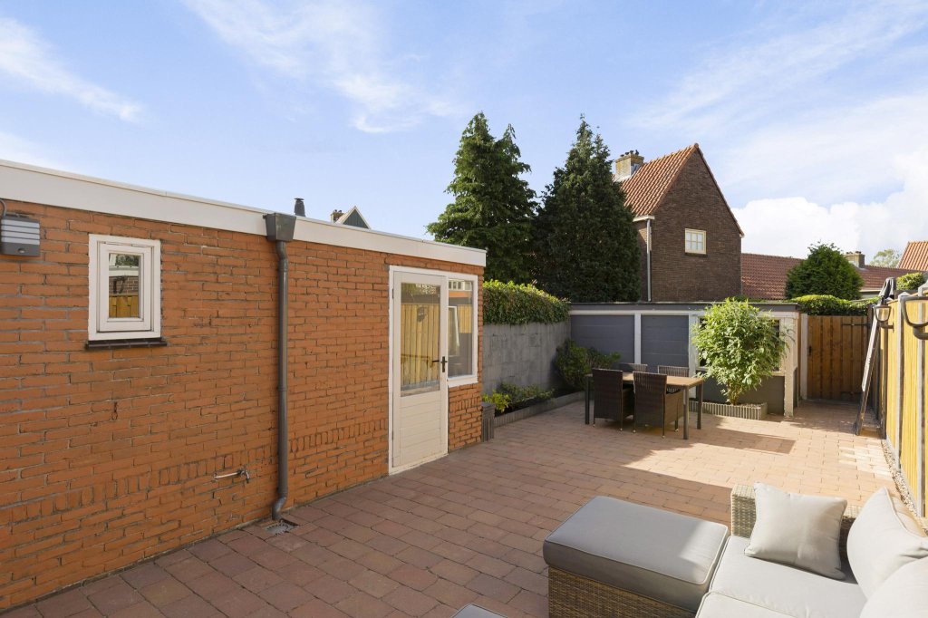 De woonkamer heeft openslaande deuren naar heerlijke tuin op het zuiden. Achterin de tuin is een stenen berging. De tuin is volledig betegeld en voorzien van enkele borders.