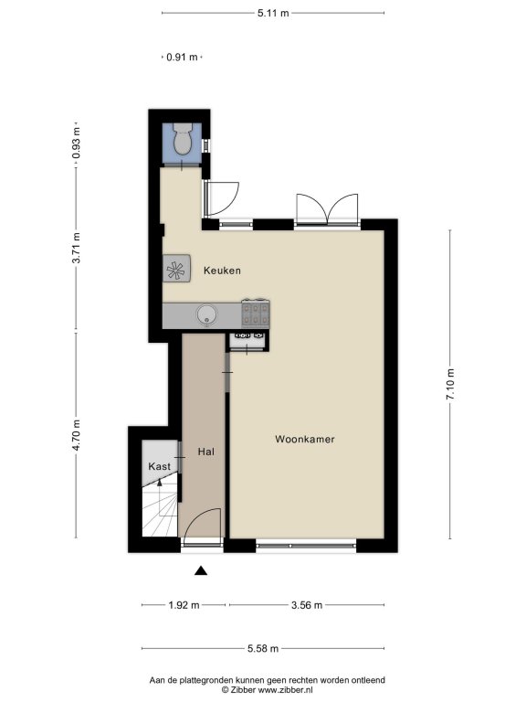Hal met trapopgang, provisiekast, ruime woonkamer met laminaat vloer, vloerisolatie en een keuken voorzien van diverse apparatuur, bijkeuken en toilet. Er is een aanbouw met c.v. -opstelling en aansluiting voor wasmachine en droger.