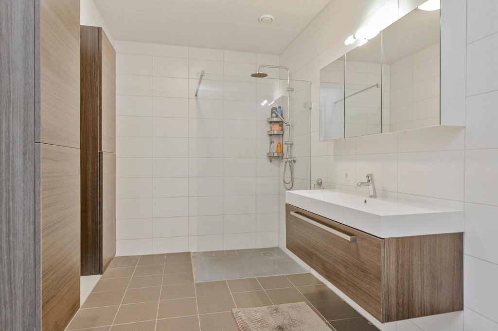 1e verdieping: overloop, 3 slaapkamers waarvan 2 zeer ruim en 1 slaapkamer/kantoor, moderne badkamer met douche, wastafel, toilet en vloerverwarming, kast met wasmachine aansluiting.