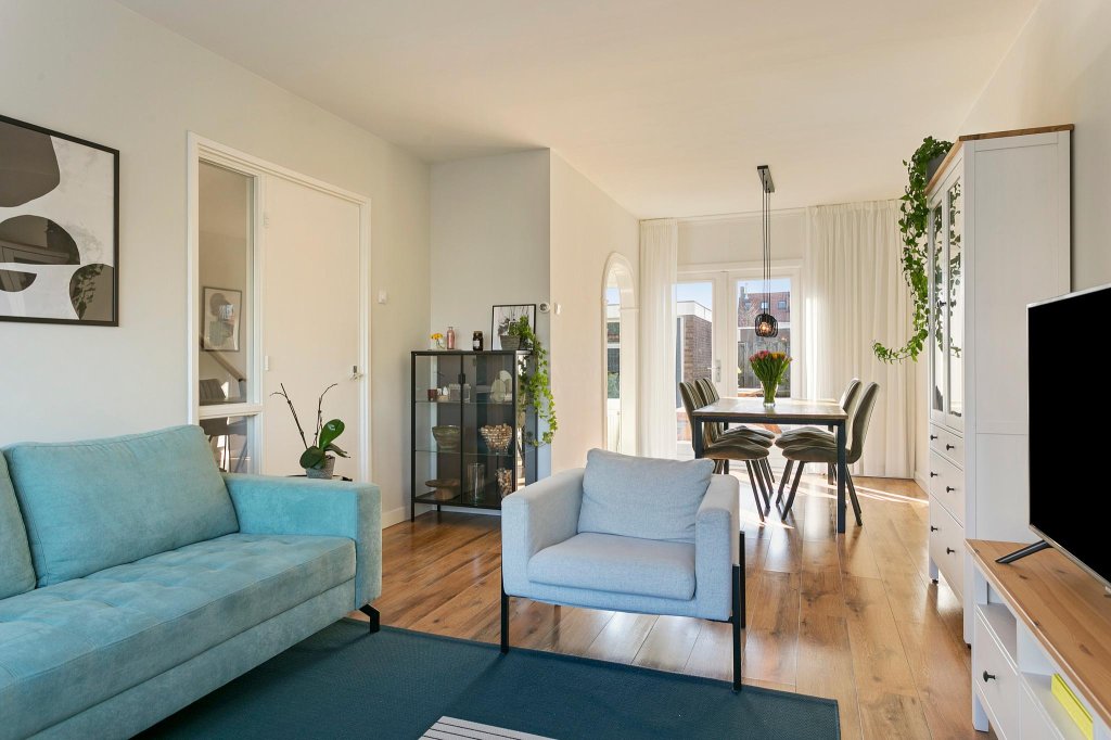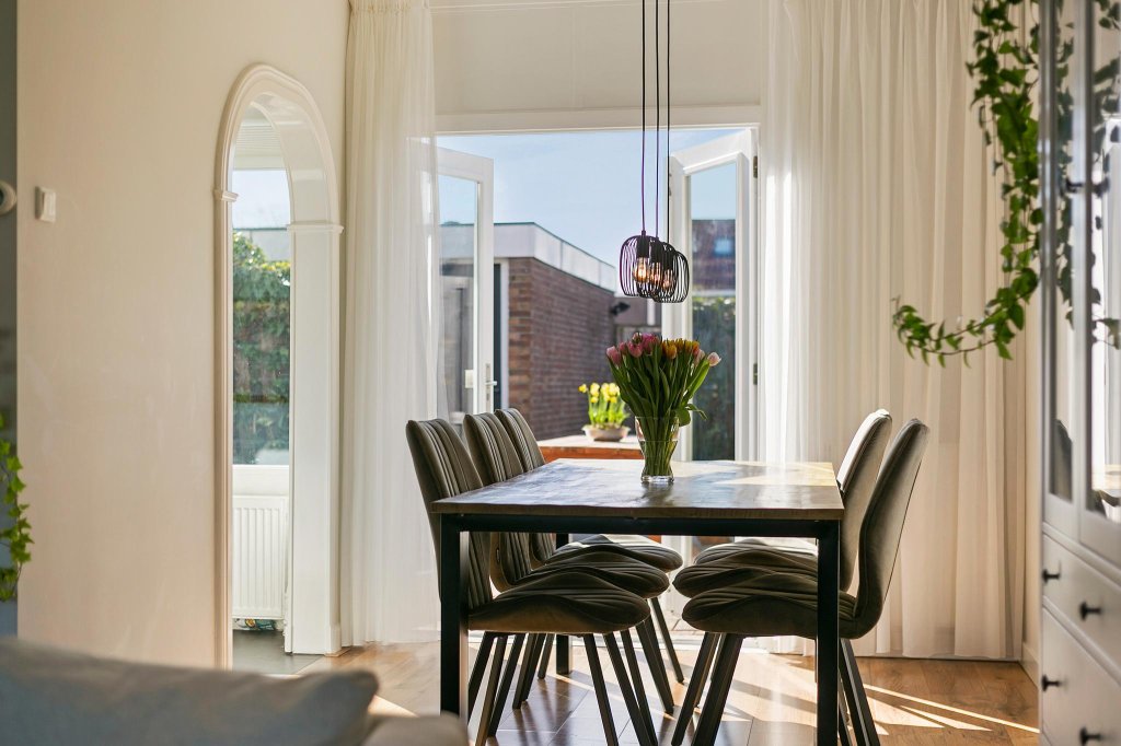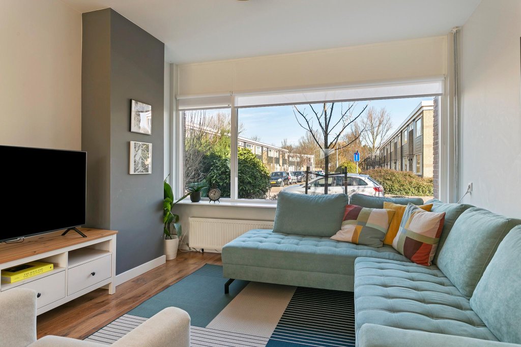 De woonkamer is lekker licht en heeft aan de kant van de achtertuin openslaande deuren.