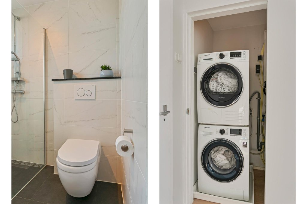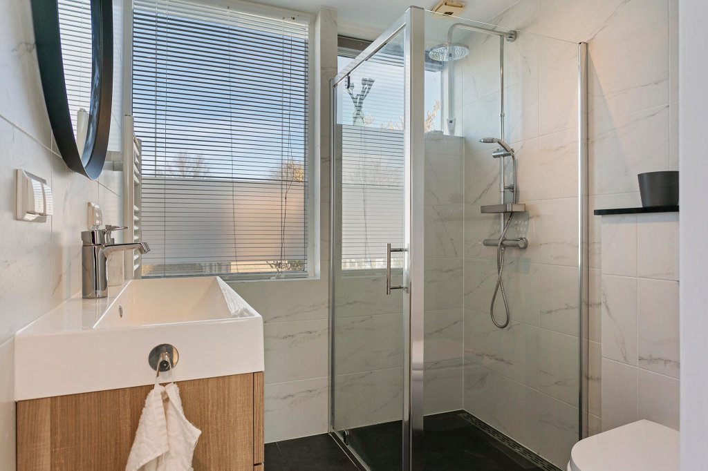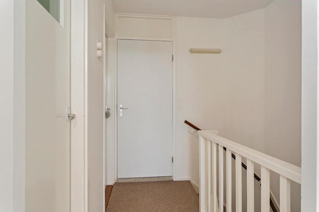 De tweekwart trap in de hal komt uit op de overloop van de 1e verdieping. Aan de voorkant is een slaapkamer en een moderne volledig betegelde badkamer. Deze is voorzien van een ruim badmeubel met spiegel, mooie glazen douchecabine met (regen)douche en hangend toilet. Aan de achterzijde zijn (slaap)kamers 2 en 3. De grootste slaapkamer is voorzien van een ruime kastenwand. In de 3e slaapkamer is een inbouwkast voor de CV en ruimte voor een wasmachine en droger.