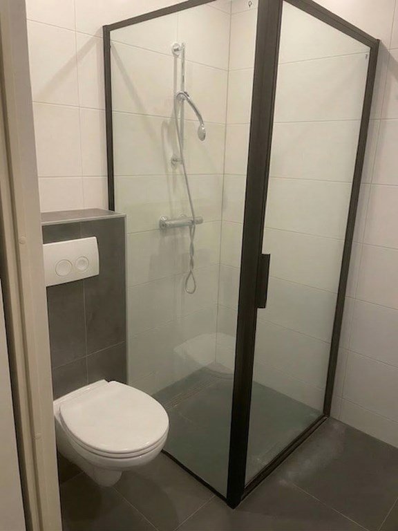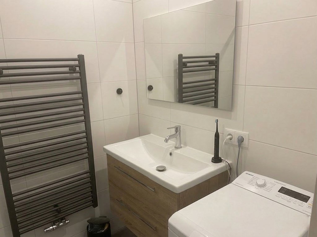 Sanitair: De moderne badkamer is volledig betegeld en uitgerust met een ruime douchecabine met glazen wanden en een wastafelmeubel. De wasmachineaansluiting bevindt zich praktisch uit het zicht in de badkamer.