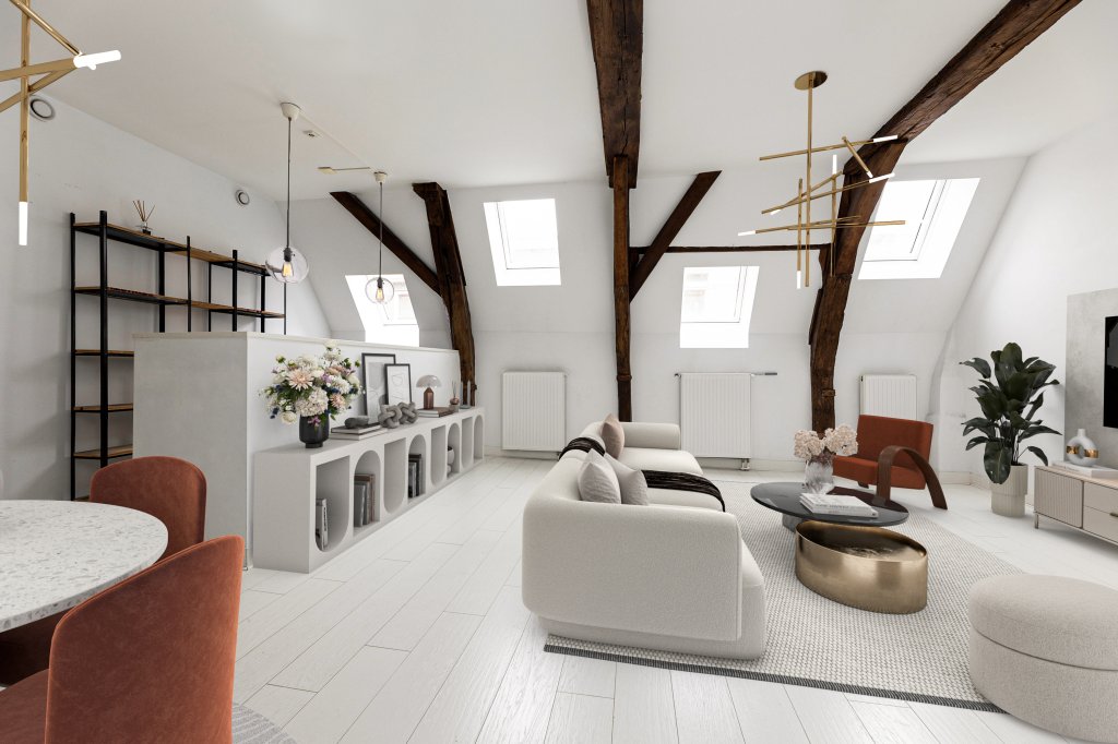 De woonkamer met open keuken is zonder twijfel het hart van dit appartement: een royale leefruimte met een indrukwekkend balkenplafond. De authentieke houten constructies geven de ruimte karakter en warmte, terwijl het strakke wit en de vele dakramen zorgen voor een lichte, frisse uitstraling.