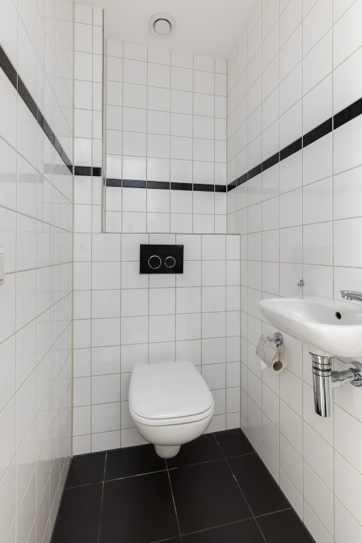 Vanuit de woonkamer bereik je de slaapkamer met badkamer ensuite. De badkamer is uitgevoerd met douche en wastafel: praktisch en klaar voor dagelijks gebruik. Nabij de entree is een separaat toilet.
