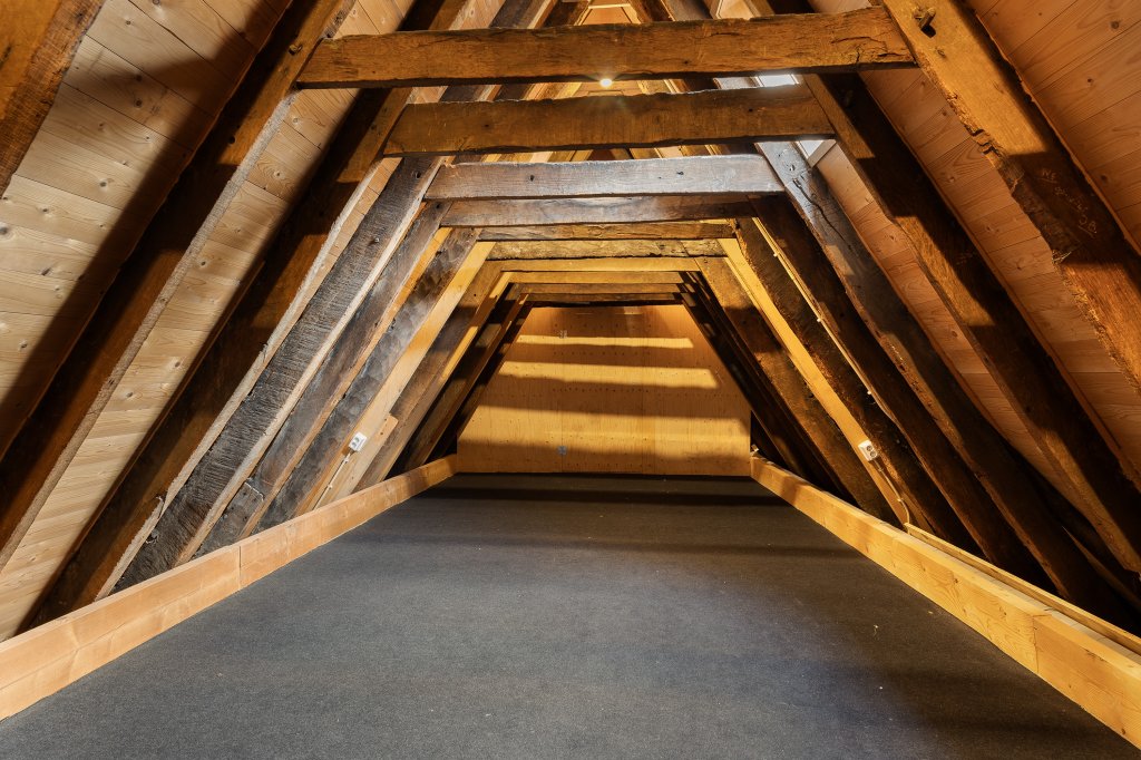 Achter de keuken ligt over de volledige breedte een extra berging: ideaal voor voorraad, een walk-in-closet of je hobby. Hier vind je ook de cv-ketel en de aansluiting voor de wasmachine. Via deze ruimte gaat een trap omhoog naar de verrassing van het huis: een zeer royale bergzolder tot in de nok. Bijzonder is dat dit waarschijnlijk het oudste particuliere dak van Kampen is, geplaatst in 14e eeuw (en toen al meer dan 100 jaar oud!).