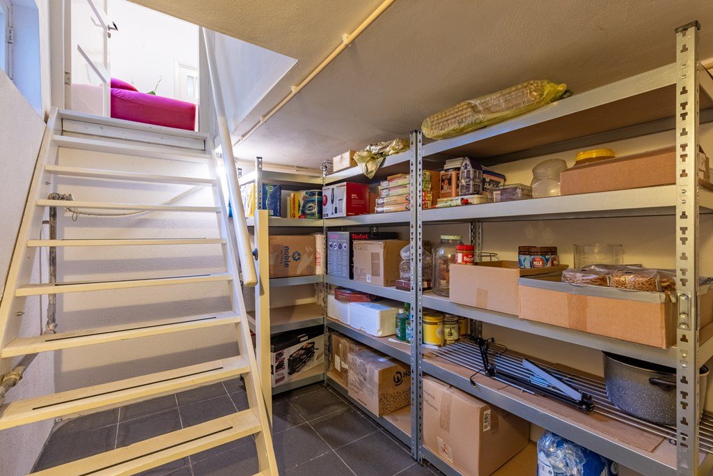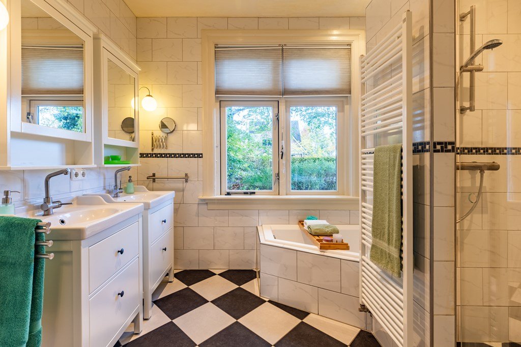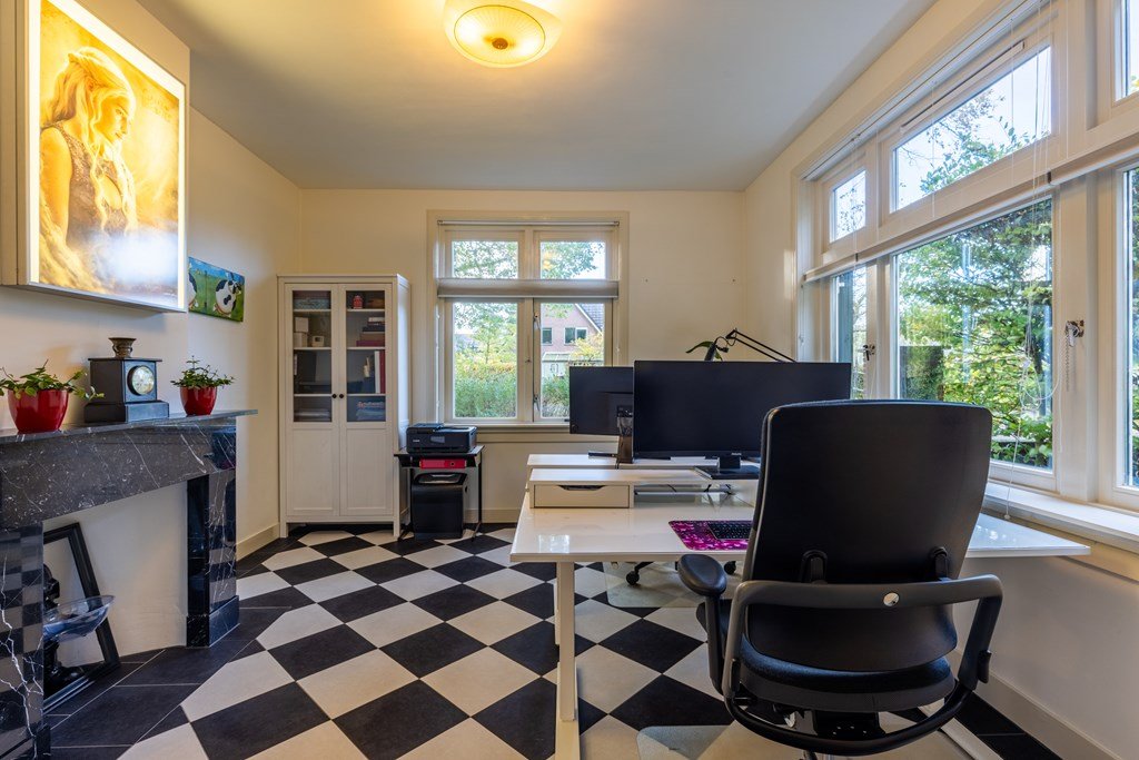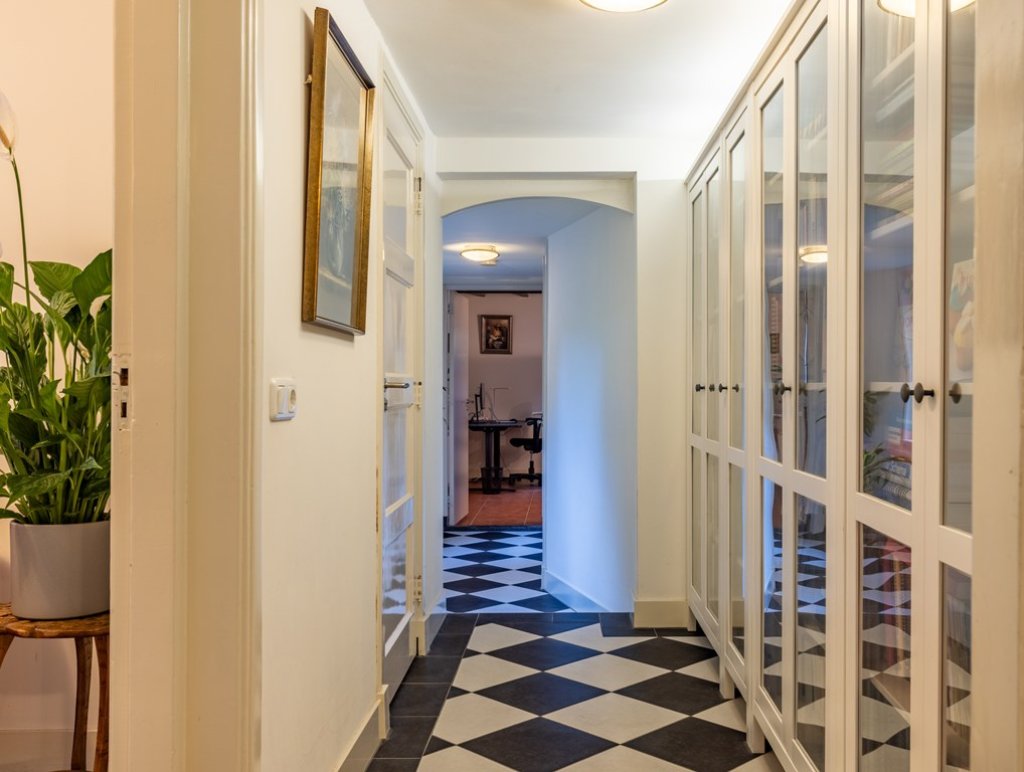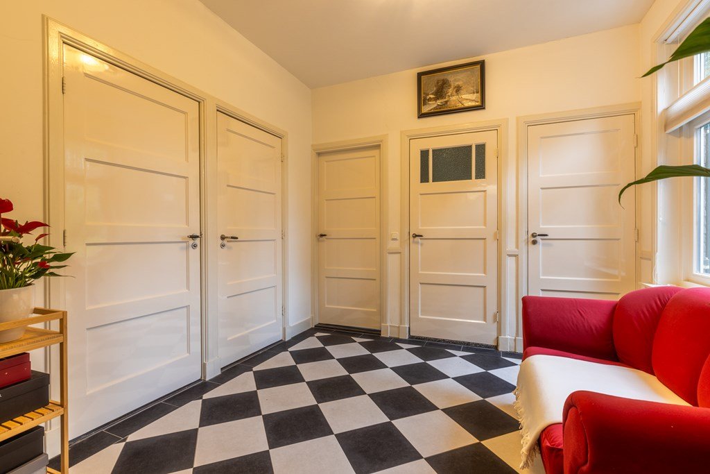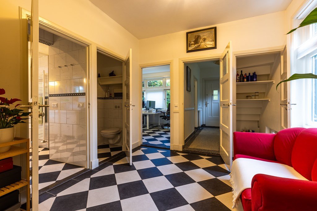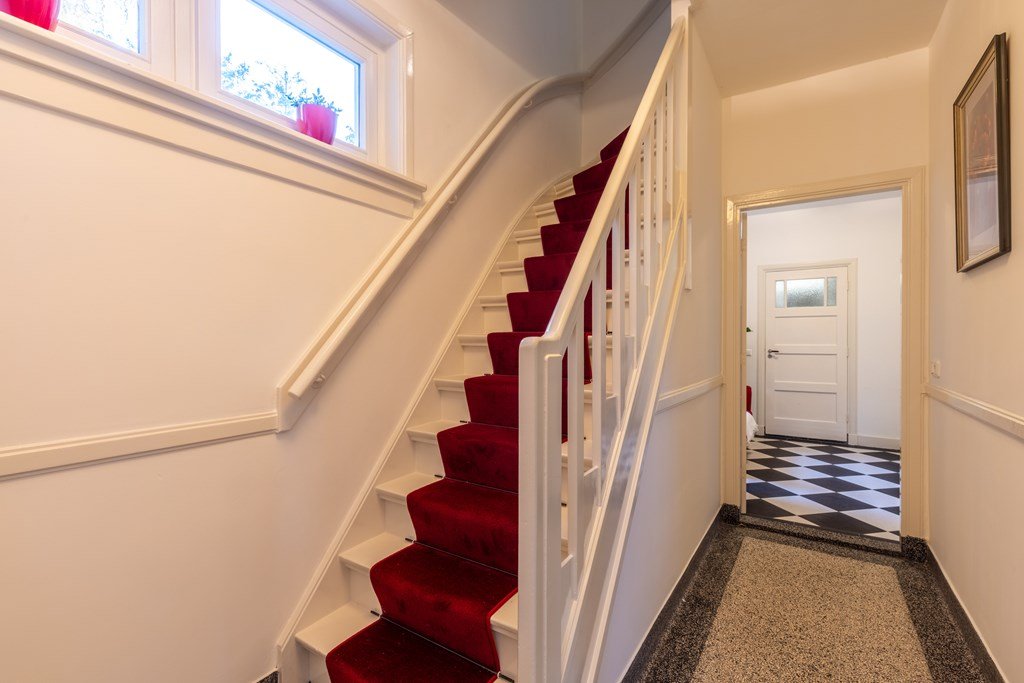 De stijlvolle entree met originele granito vloer en een prachtige houten trap met rode loper zet direct de toon voor de rest van de woning. Vanuit de hal zijn de verschillende vertrekken bereikbaar: een charmante ontvangstkamer, een werk- of slaapkamer met klassieke schouw, de kelder, een toilet, een badkamer met dubbele wastafel, ligbad en separate douche, en een aparte wasruimte.